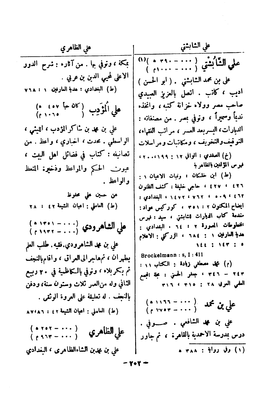 (ط) العاملي: اعيان الشيعة 42: 86، 87 علي الظاهري (..- 252 هـ) (..- 963 م) علي بن محمد بن الشاه الظاهرى، البغدادي