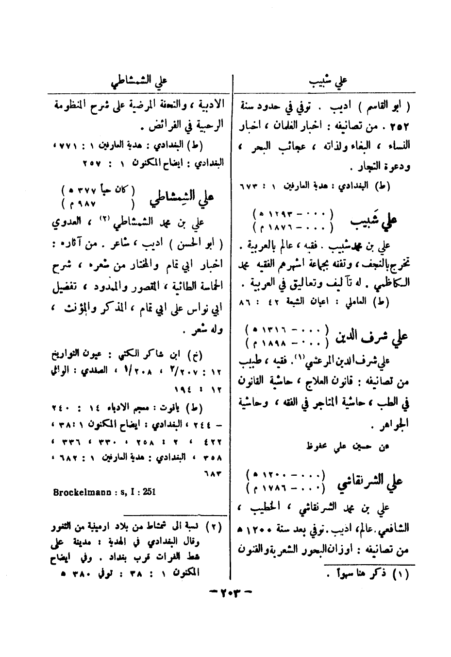 (ط) البغدادي: هدية العارفين 1: 771، البغدادي: ايضاح المكنون 1: 257 علي الشمشاطي (كان حيا 377 هـ) (987 م) علي بن محمد الشمشاطي (2) ، العدوي (أبو الحسن) اديب، شاعر.