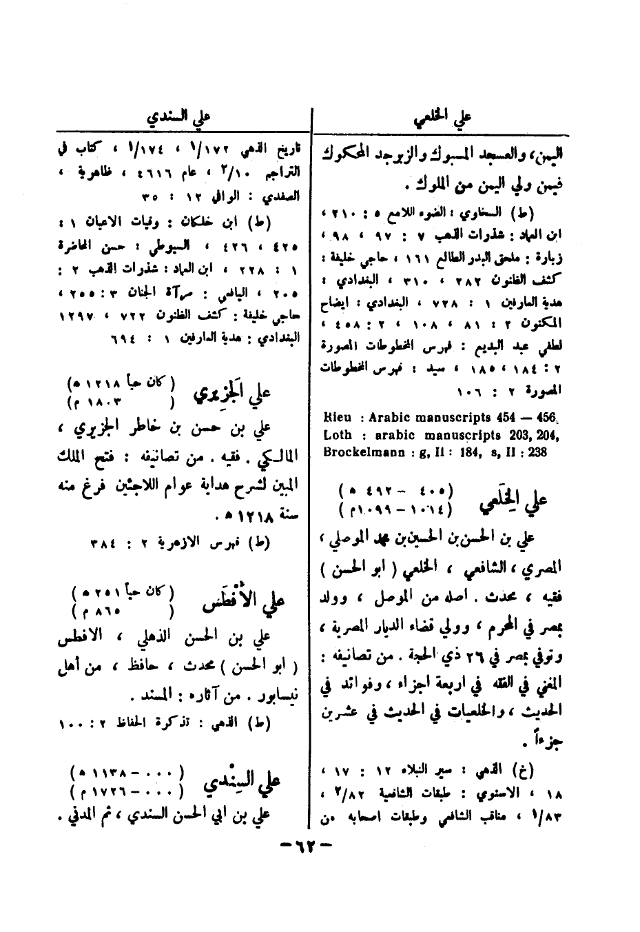 (ط) الذهبي: تذكرة الحفاظ 2: 100 علي السندي (..- 1138 هـ) (..- 1726 م) علي بن ابي الحسن السندي، ثم المدني.