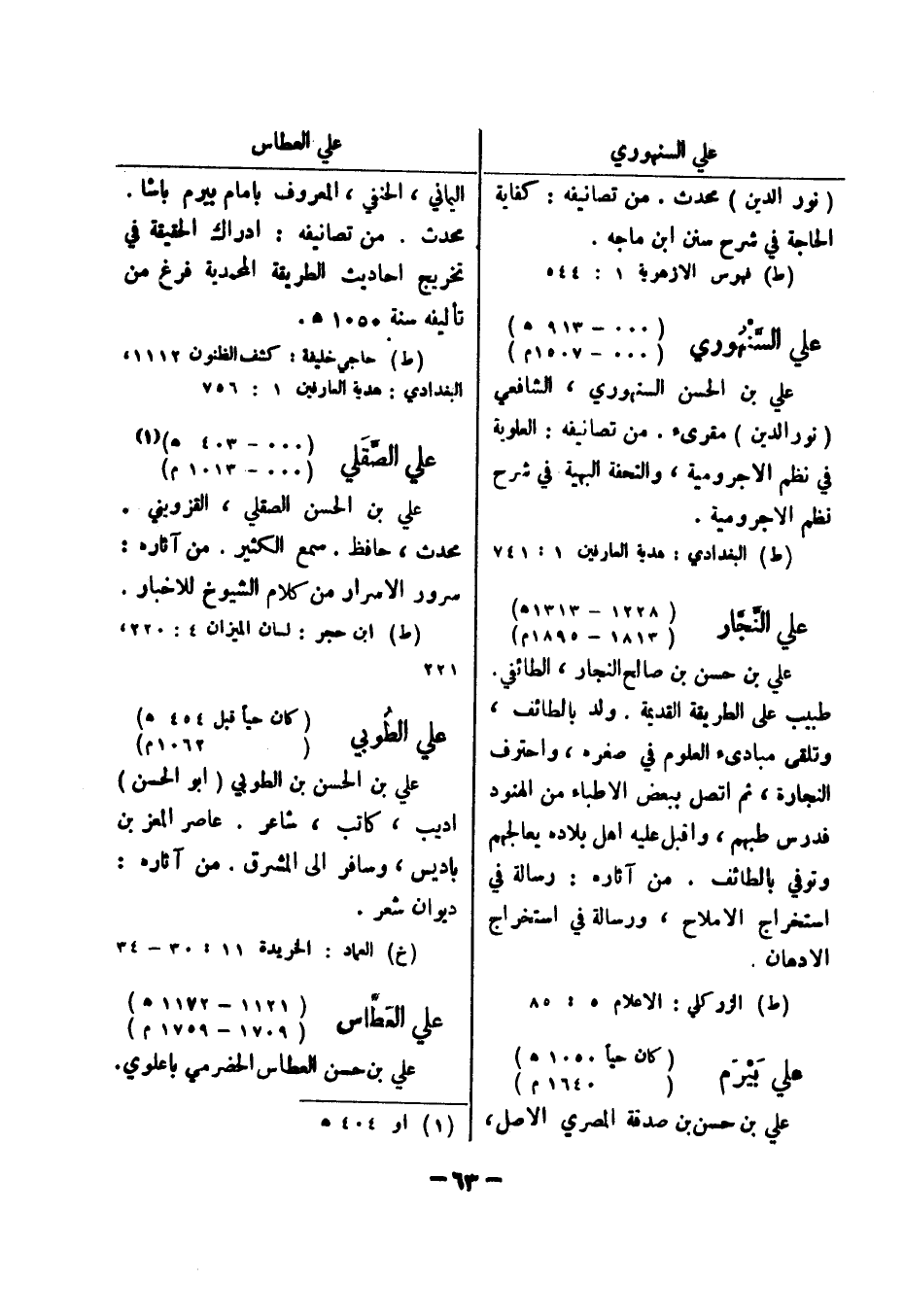 (ط) البغدادي: هدية العارفين 1: 741 علي النجار (1228 - 1313 هـ) (1813 - 1895 م) علي بن حسن بن صالح النجار، الطائفي.