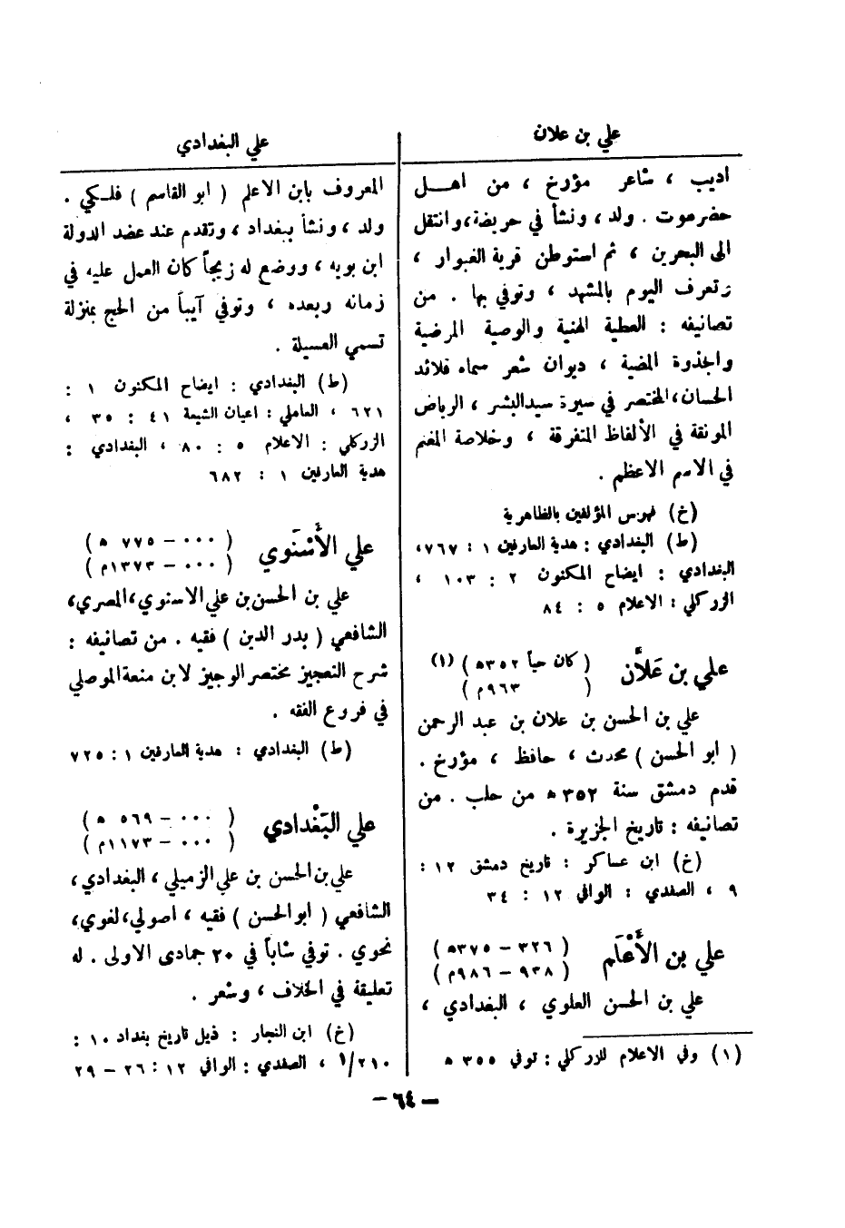 (خ) ابن عساكر: تاريخ دمشق 12: 9، الصفدي: الوافي 12: 34 علي بن الاعلم (326 - 375 هـ) (938 - 986 م) علي بن الحسن العلوي، البغدادي،