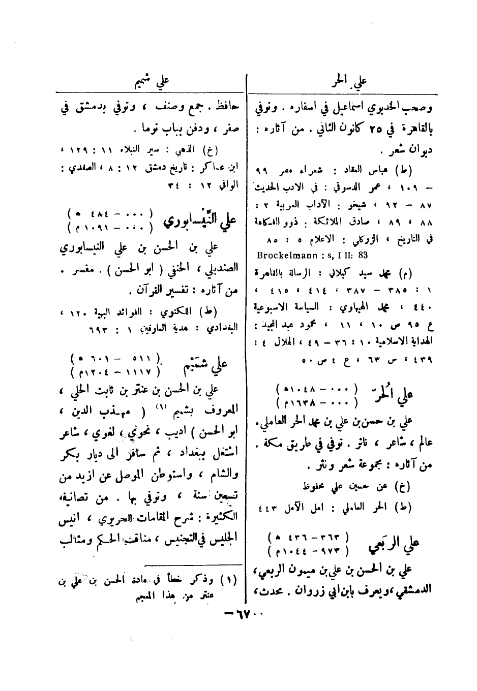في التاريخ، الزركلي: الاعلام 5: 85 83: Brockelmann: s , I II (م) محمد سيد كيلاني: الرسالة بالقاهرة 1: 385 - 387، 414، 415، 440، محمد الهيهاوي: السياسة الاسبوعية ع 95 ص 10، 11، محمود عبد المجيد: الهداية الاسلامية 10: 36 - 49، الهلال 4: 439، س 63، ع 4 ص 50 علي الحر (..- 1048 هـ) (..- 1638 م) علي بن حسن بن علي بن محمد الحر العاملي.