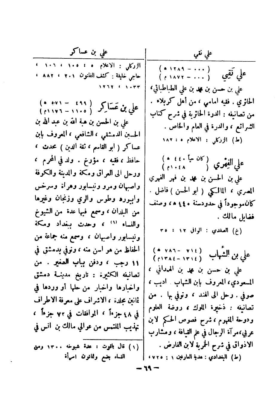 (ط) البغدادي: هدية العارفين 1: 725، الزركلي: الاعلام 5: 105، 106، حاجي خليفة: كشف الظنون 201، 882، 1033، 1262 علي بن عساكر (499 - 571 هـ) (1105 - 1176 م) علي بن الحسن بن هبة الله بن عبد الله بن الحسين الدمشقي، الشافعي، المعروف بابن عساكر (أبو القاسم، ثقة الدين) محدث، حافظ، فقيه، مؤرخ.