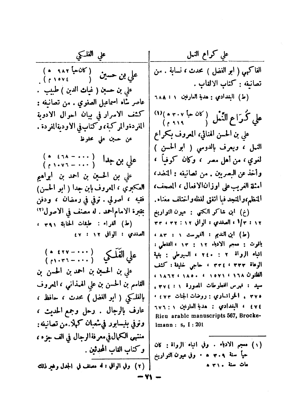 (ط) البغدادي: هدية العارفين 1: 688 علي كراع النمل (كان حيا 307 هـ) (1) (919 م) علي بن الحسن الهنائي، المعروف بكراع النمل، ويعرف بالدوسي (أبو الحسن) لغوي، من أهل مصر، وكان كوفيا، وأخذ عن البصريين.
