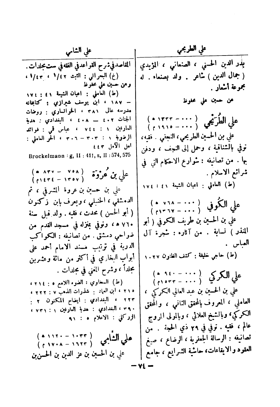 (ط) حاجي خليفة: كشف الظنون 1027 علي الكركي (..- 940 هـ) (..- 1533 م) علي بن الحسين بن عبد العالي الكركي، العاملي، المعروف بالمحقق الثاني، والمحقق الكركي، وبالشيخ العلائي، وبالمولى المروج عالم، فقيه.