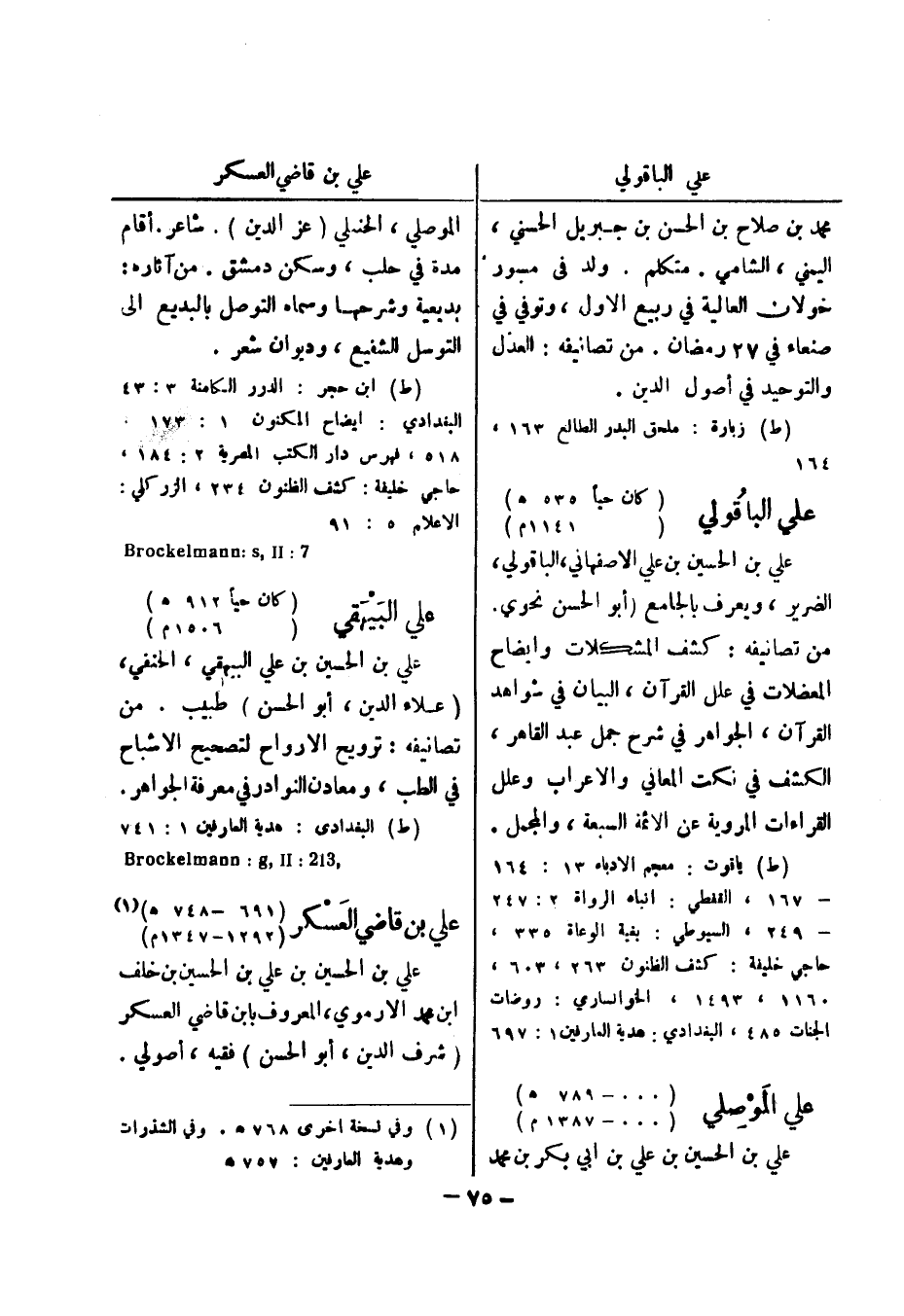 (ط) البغدادي: هدية العارفين 1: 741 , 213: Brockelmann: g , II علي بن قاضي العسكر (691 - 748 هـ) (1) (1292 - 1347 م) علي بن الحسين بن علي بن الحسين بن خلف ابن محمد الارموي، المعروف بابن قاضي العسكر (شرف الدين، أبو الحسن) فقيه، أصولي.