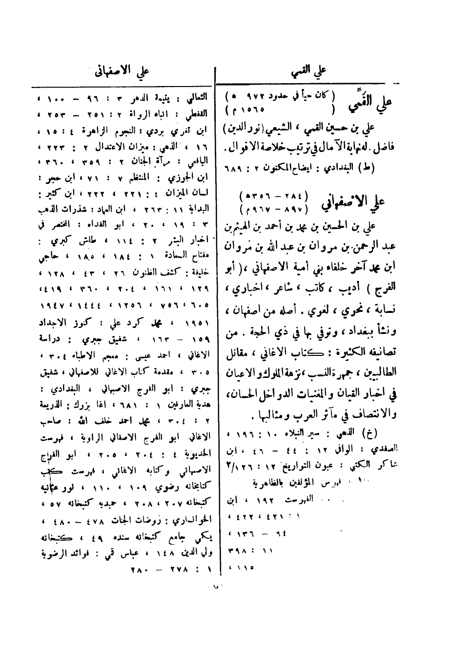 (ط) البغدادي: ايضاح المكنون 2: 689 علي الاصفهاني (284 - 356 هـ) (897 - 967 م) علي بن الحسين بن محمد بن أحمد بن الهيثم بن