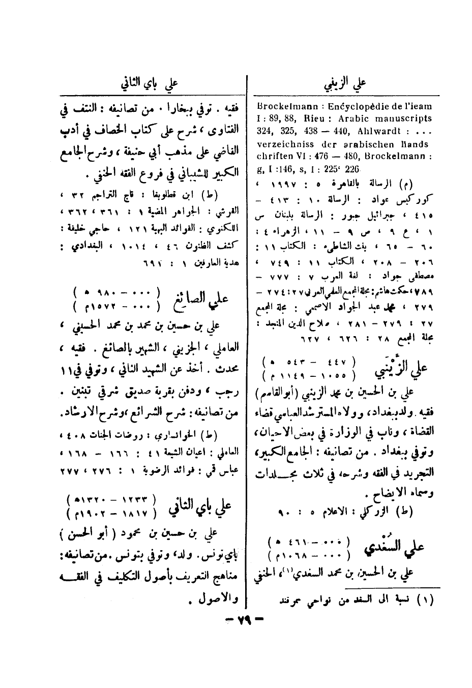 (ط) الخوانساري: روضات الجنات 408، العاملي: اعيان الشيعة 41: 166 - 168، عباس قمي: فوائد الرضوية 1: 276، 277 علي باي الثاني (1233 - 1320 هـ) (1817 - 1902 م) علي بن حسين بن محمود (أبو الحسن) باي تونس.