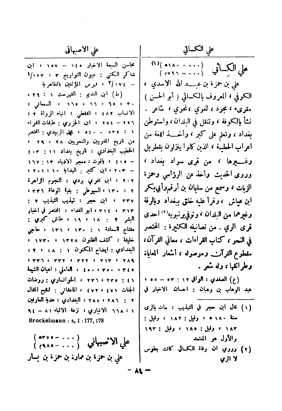 الجنات 471، 472، المامقاني: تنقيح المقال 2: 286، 287، البغدادي: هدية العارفين 1: 668 الانباري: نزهة الالباء 81 - 94 178 , 177: Brockelmann: s , I علي الاصبهاني (..- 375 هـ) (..- 985 م) علي بن حمزة بن عمارة بن حمزة بن يسار