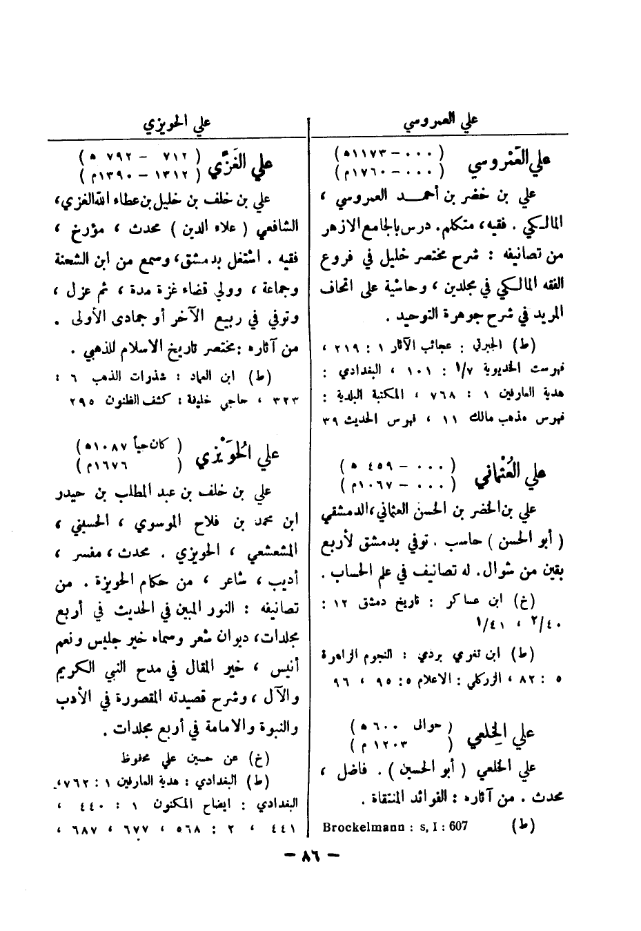 (ط) 607: Brockelmann: s , I علي الغزي (712 - 792 هـ) (1312 - 1390 م) علي بن خلف بن خليل بن عطاء الله الغزي، الشافعي (علاء الدين) محدث، مؤرخ، فقيه.