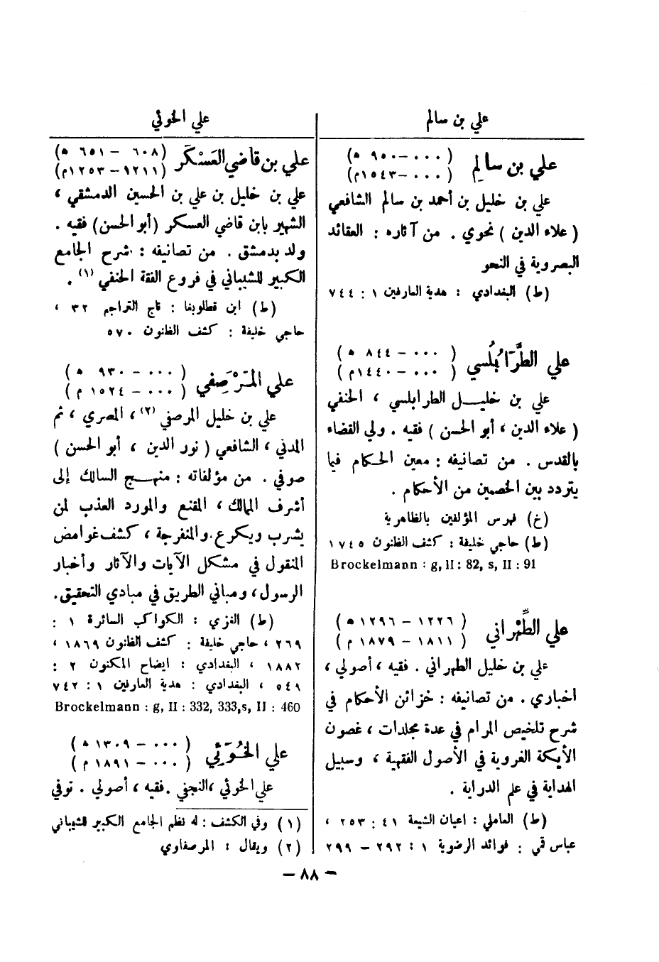 (ط) الغزي: الكواكب السائرة 1: 269، حاجي خليفة: كشف الظنون 1869، 1882، البغدادي: ايضاح المكنون 2: 549، البغدادي: هدية العارفين 1: 742 460: Brockelmann: g , II: 233 , 333 , s , II علي الخوئي (..- 1309 هـ) (..- 1891 م) علي الخوئي، النجفي.