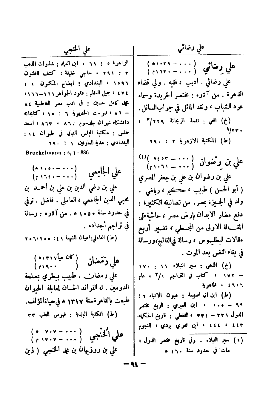 (خ) المحبي: نفحة الريحانة 229 / 2 230 / 1 (ط) المكتبة الازهرية 2: 290 علي بن رضوان (..- 453 هـ) (1) (..- 1061 م) علي بن رضوان بن علي بن جعفر المصري (أبو الحسن) طبيب، حكيم، رياضي.