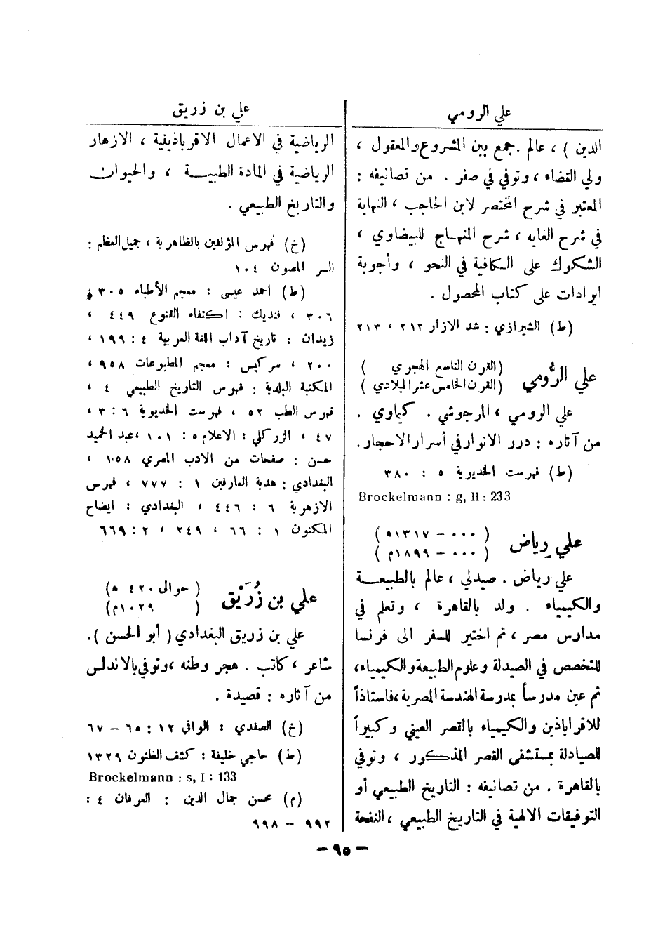 47، الزر كلي: الاعلام 5: 101، عبد الحميد حسن: صفحات من الادب المصري 158، البغدادي: هدية العارفين 1: 777، فهرس الازهرية 6: 446، البغدادي: ايضاح المكنون 1: 66، 249، 2: 669 علي بن زريق (حوالى 420 هـ) (1029 م) علي بن زريق البغدادي (أبو الحسن) .