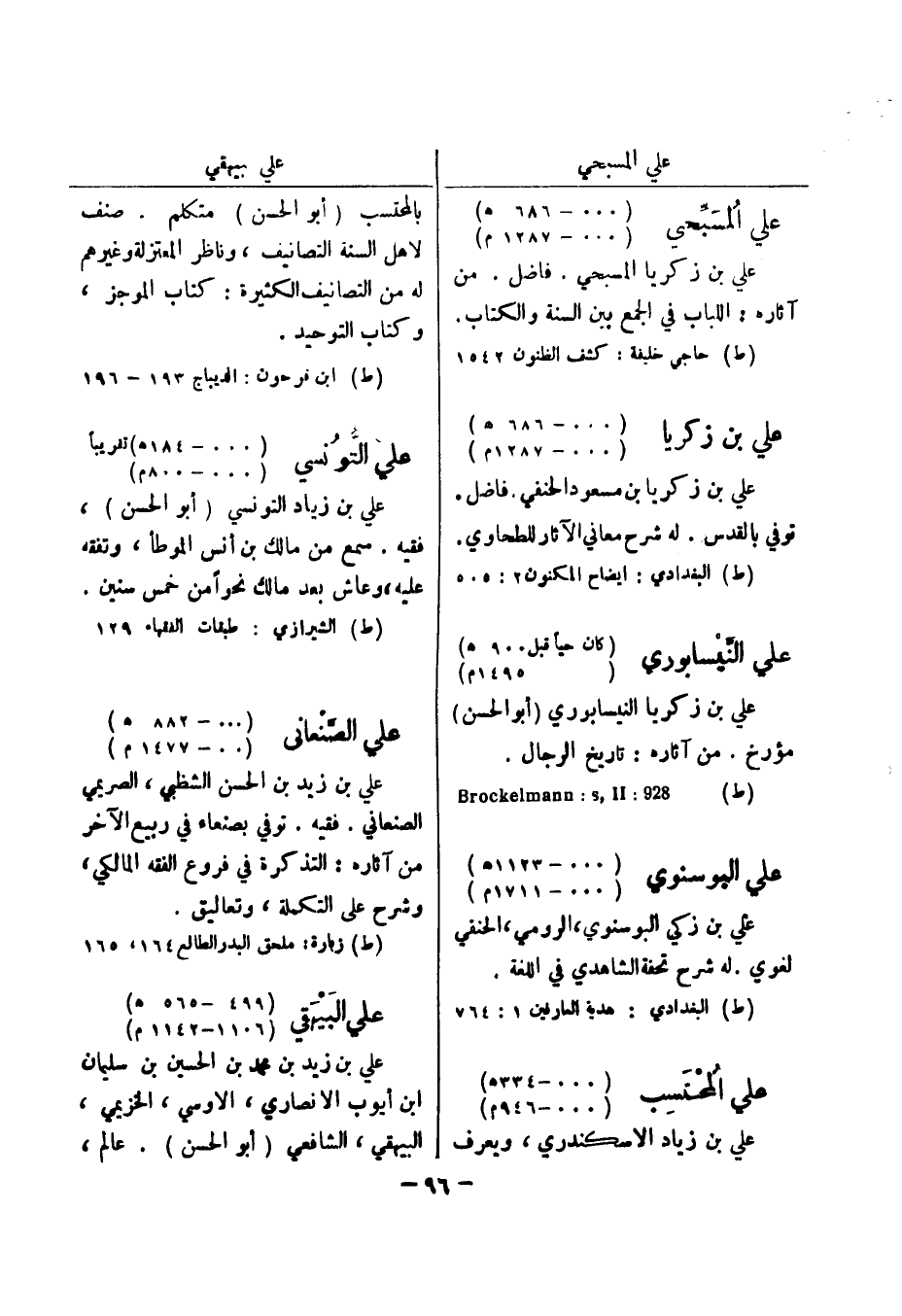(ط) البغدادي: ايضاح المكنون 2: 505 علي النيسابوري (كان حيا قبل 900 هـ) (1495 م) علي بن زكريا النيسابوري (أبو الحسن) مؤرخ.