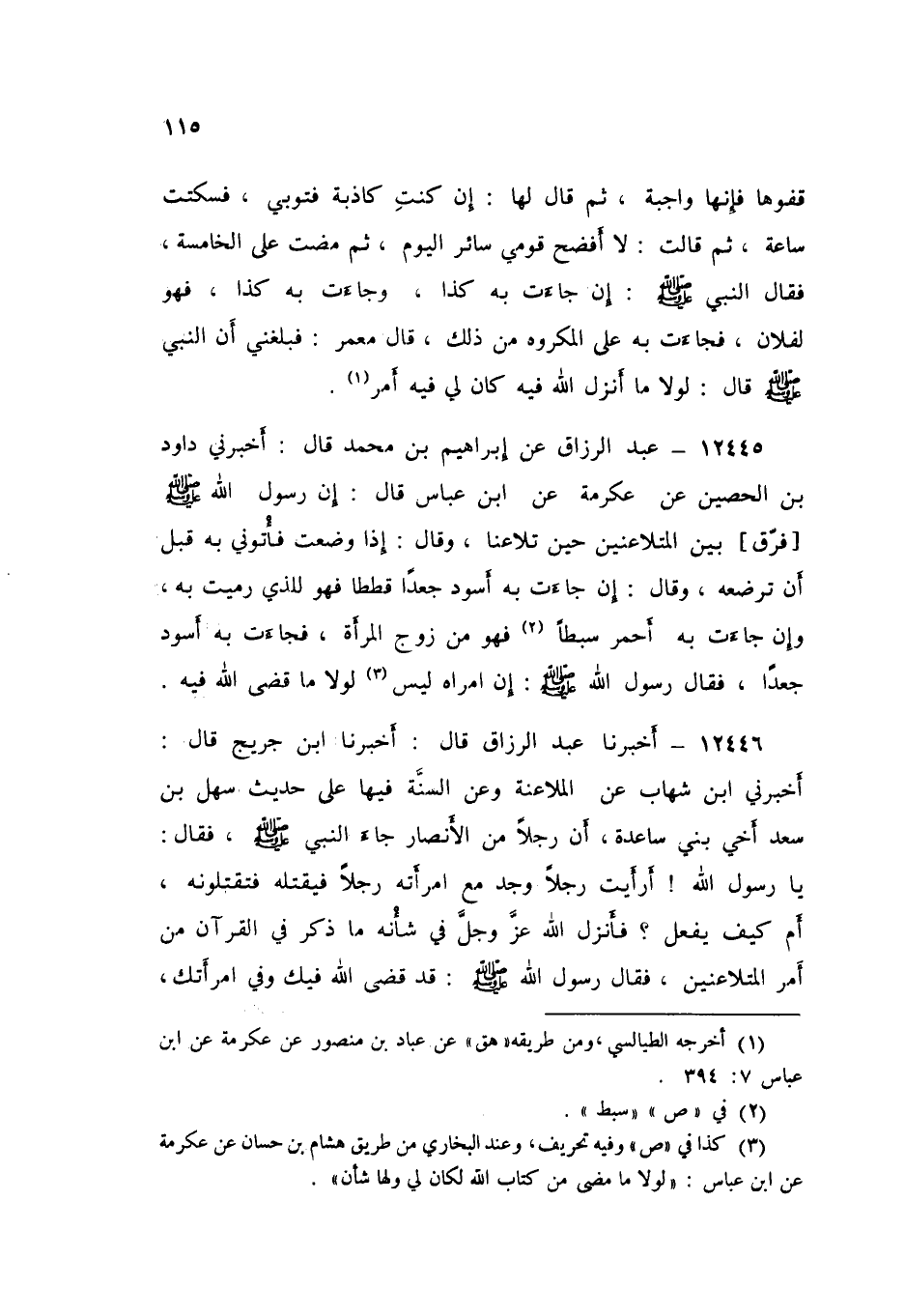 ١٢٤٤٦ - عَبْدُ الرَّزَّاقِ قَالَ: أَخْبَرَنَا ابْنُ جُرَيْجٍ قَالَ: أَخْبَرَنِي ابْنُ شِهَابٍ، عَنِ الْمُلَاعَنَةِ، وَعَنِ السُّنَّةِ فِيهَا عَلَى حَدِيثِ سَهْلِ بْنِ سَعْدٍ أَخِي بَنِي سَاعِدَةَ أَنَّ رَجُلًا، مِنَ الْأَنْصَارِ جَاءَ النَّبِيَّ صَلَّى اللهُ عَلَيْهِ وَسَلَّمَ فَقَالَ: يَا رَسُولَ اللَّهِ، أَرَأَيْتَ رَجُلًا وَجَدَ مَعَ امْرَأَتِهِ رَجُلًا فَيَقْتُلُهُ فَتَقْتُلُونَهُ أَمْ كَيْفَ يَفْعَلُ؟ فَأَنْزَلَ اللَّهُ عَزَّ وَجَلَّ فِي شَأْنِهِ مَا ذُكِرَ فِي الْقُرْآنِ مِنْ أَمْرِ الْمُتَلَاعِنَيْنِ، فَقَالَ رَسُولُ اللَّهِ صَلَّى اللهُ عَلَيْهِ وَسَلَّمَ: «قَدْ قَضَى اللَّهُ فِيكَ وَفِي امْرَأَتِكَ» ⦗١١٦⦘ قَالَ: فَتَلَاعَنَا فِي الْمَسْجِدِ وَأَنَا حَاضِرٌ قَالَ: فَلَمَّا فَرَغَا قَالَ: كَذَبْتُ عَلَيْهَا يَا رَسُولَ اللَّهِ إِنْ أَمْسَكْتُهَا فَطَلَّقَهَا ثَلَاثًا قَبْلَ أَنْ يَأْمُرَهُ النَّبِيُّ صَلَّى اللهُ عَلَيْهِ وَسَلَّمَ حِينَ فَرَغَا مِنَ التَّلَاعُنِ فَفَارَقَهَا عِنْدَ النَّبِيِّ صَلَّى اللهُ عَلَيْهِ وَسَلَّمَ، فَقَالَ النَّبِيُّ صَلَّى اللهُ عَلَيْهِ وَسَلَّمَ: «ذَلِكَ التَّفْرِيقُ بَيْنَ كُلِّ مُتَلَاعِنَيْنِ» وَكَانَتْ حَامِلًا فَأَنْكَرَهُ فَكَانَ ابْنُهَا يُدْعَى لِأُمِّهِ