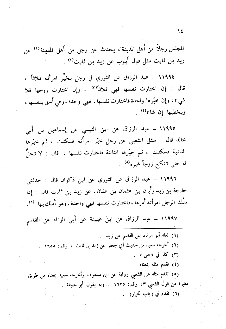 ١١٩٩٧ - عَنِ ابْنِ عُيَيْنَةَ، عَنْ أَبِي الزِّنَادِ، عَنِ الْقَاسِمِ بْنِ مُحَمَّدٍ، عَنْ زَيْدِ بْنِ ثَابِتٍ فِي رَجُلٍ جَعَلَ أَمْرَ امْرَأَتِهِ بِيَدِهَا فَطَلَّقَتْ نَفْسَهَا ثَلَاثًا قَالَ: «هِيَ وَاحِدَةٌ»