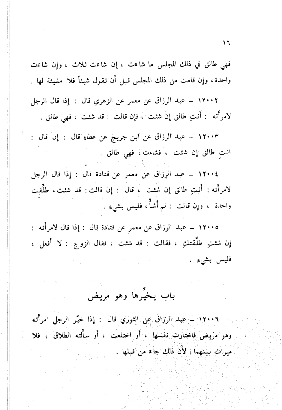 ١٢٠٠٦ - عَنِ الثَّوْرِيِّ، قَالُ: «إِذَا خَيَّرَ الرَّجُلُ امْرَأَتَهُ وَهُوَ مَرِيضٌ فَاخْتَارَتْ نَفْسَهَا، أَوِ اخْتَلَعَتْ، أَوْ سَأَلَتْهُ الطَّلَاقَ، فَلَا مِيرَاثَ بَيْنَهُمَا، لِأَنَّ ذَلِكَ جَاءَ مِنْ قِبَلِهَا»