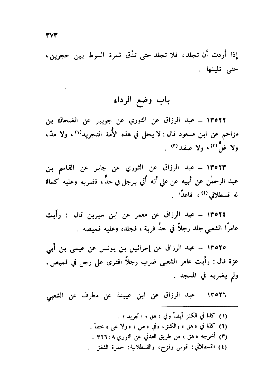 ١٣٥٢٣ - عَنِ الثَّوْرِيِّ، عَنْ جَابِرٍ، عَنِ الْقَاسِمِ بْنِ عَبْدِ الرَّحْمَنِ، عَنْ أَبِيهِ، عَنْ عَلِيٍّ أَنَّهُ أُتِيَ بِرَجُلٍ فِي حَدٍّ فَضَرَبَهُ وَعَلَيْهِ كِسَاءٌ لَهُ قَسْطَلَانِيٌّ قَاعِدًا "