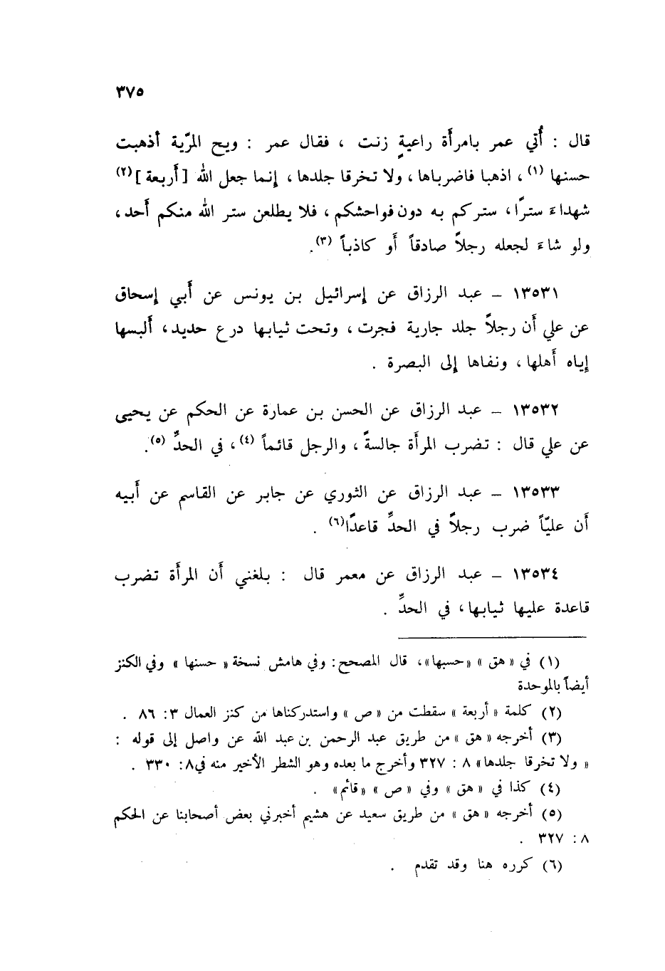 ١٣٥٣٤ - عَنْ مَعْمَرٍ قَالَ: بَلَغَنِي «أَنَّ الْمَرْأَةَ تُضْرَبُ قَاعِدَةً عَلَيْهَا ثِيَابُهَا فِي الْحَدِّ»