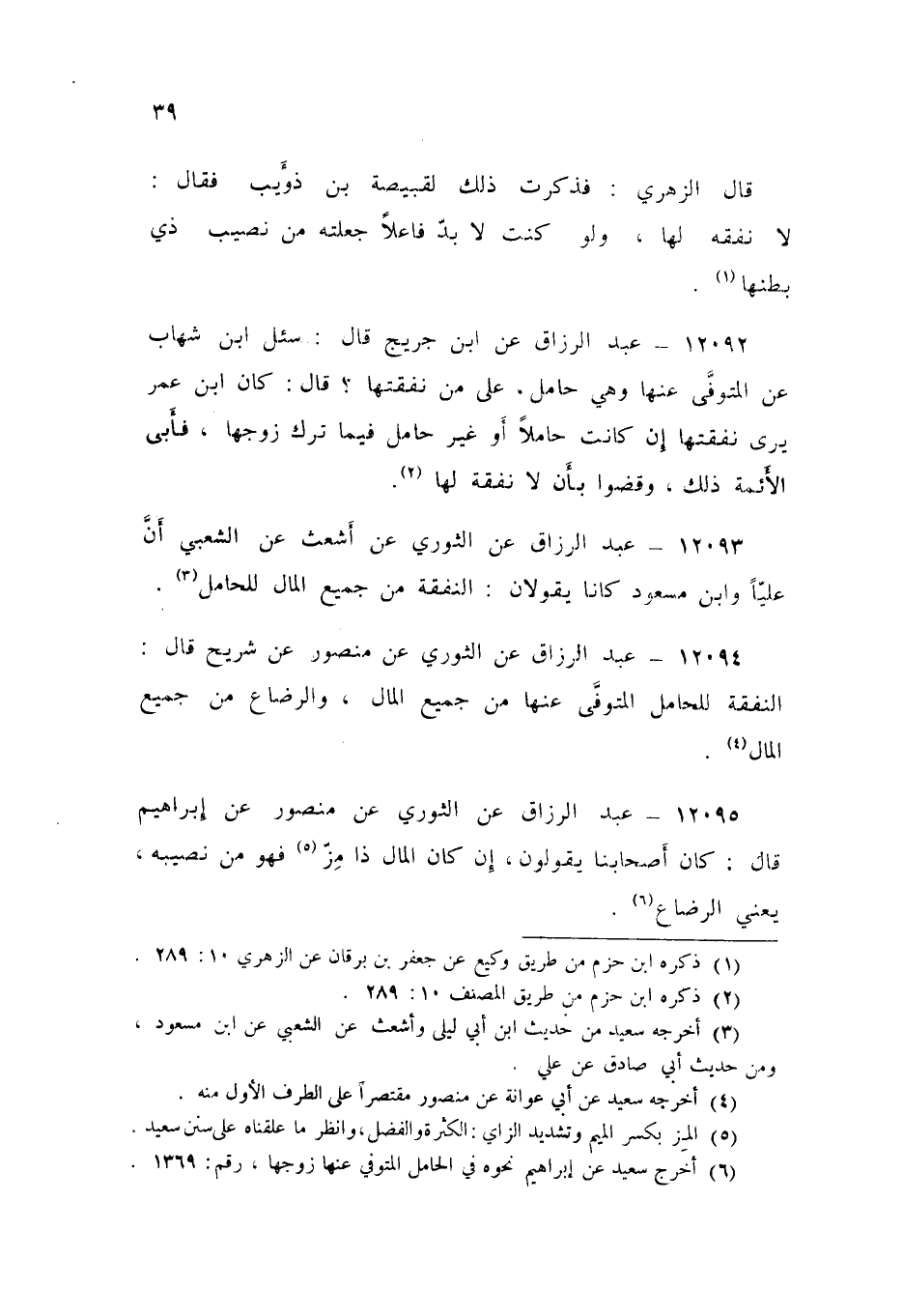 ١٢٠٩٣ - عَنِ الثَّوْرِيِّ، عَنْ أَشْعَثَ، عَنِ الشَّعْبِيِّ، أَنَّ عَلِيًّا، وَابْنَ مَسْعُودٍ، كَانَا يَقُولَانِ: «النَّفَقَةُ مِنْ جَمِيعِ الْمَالِ لِلْحَامِلِ»