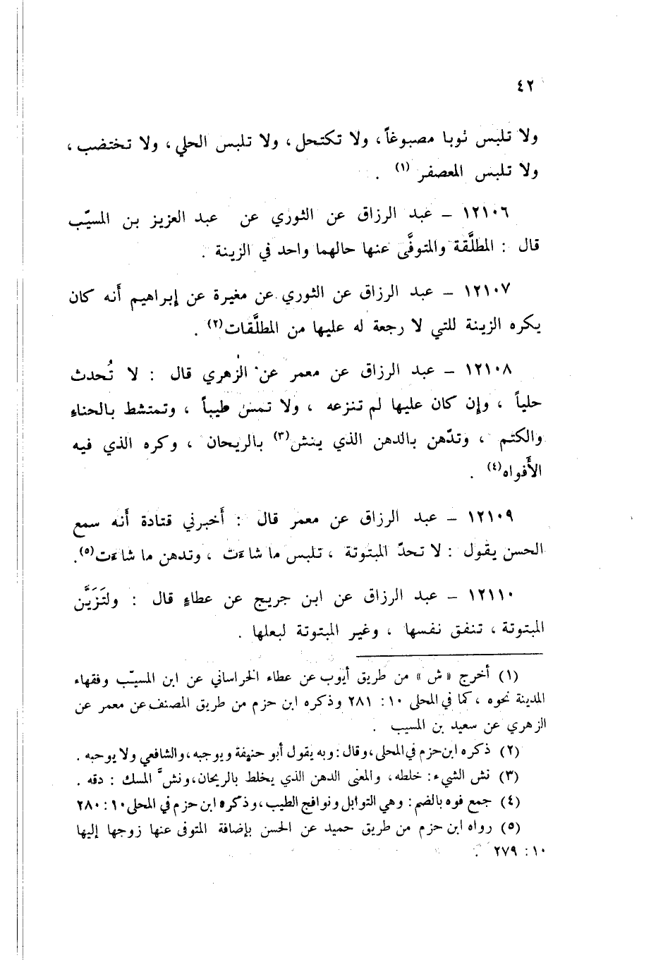١٢١٠٨ - عَنْ مَعْمَرٍ، عَنِ الزُّهْرِيِّ، قَالُ: «لَا تُحْدِثُ حُلِيًّا، وَإِنْ كَانَ عَلَيْهِا لَمْ تَنْزِعْهُ، وَلَا تَمَسُّ طِيبًا، وَتَمْتَشِطُ بِالْحِنَّاءِ، وَالْكَتَمِ، وَتَدَّهِنُ بِالدُّهْنِ الَّذِي يُنَشُّ بِالرَّيْحَانِ، وَكُرِهَ الَّذِي فِيهِ الْأَفْوَاهُ»