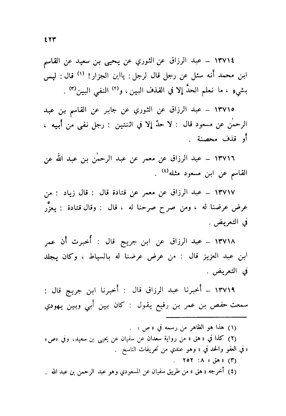 ١٣٧١٩ - عَبْدُ الرَّزَّاقِ قَالَ: أَخْبَرَنَا ابْنُ جُرَيْجٍ قَالَ: سَمِعْتُ حَفْصَ بْنَ عُمَرَ بْنِ رَفِيعٍ يَقُولُ: كَانَ بَيْنَ أَبِي، وَبَيْنَ يَهُودِيٍّ مُدَافَعَةٌ فِي الْقَوْلِ فِي شُفْعَةٍ، فَقَالَ أَبِي لِلْيَهُودِيِّ: يَهُودِيٌّ ابْنُ يَهُودِيٍّ. فَقَالَ: أَجَلْ، وَاللَّهِ إِنِّي لَيَهُودِيٌّ ابْنُ يَهُودِيٍّ إِذْ لَا يَعْرِفُ رِجَالٌ كَثِيرٌ آبَاءَهُمْ، فَكَتَبَ عَامِلُ الْأَرْضِ إِلَى عُمَرَ بْنِ عَبْدِ الْعَزِيزِ وَهُوَ عَامِلٌ عَلَى الْمَدِينَةِ بِذَلِكَ فَكَتَبَ: «إِنْ كَانَ الَّذِي قَالَ لَهُ ذَلِكَ يُعْرَفُ أَبُوهُ، فَحَدَّ الْيَهُودِيَّ، فَضَرَبَهُ ثَمَانِينَ سَوْطًا»
