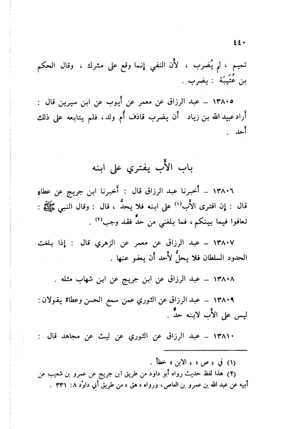١٣٨٠٦ - عَبْدُ الرَّزَّاقِ قَالَ: أَخْبَرَنَا ابْنِ جُرَيْجٍ، عَنْ عَطَاءٍ قَالَ: «إِنِ افْتَرَى الْأَبُ عَلَى ابْنِهِ، فَلَا يُحَدُّ»