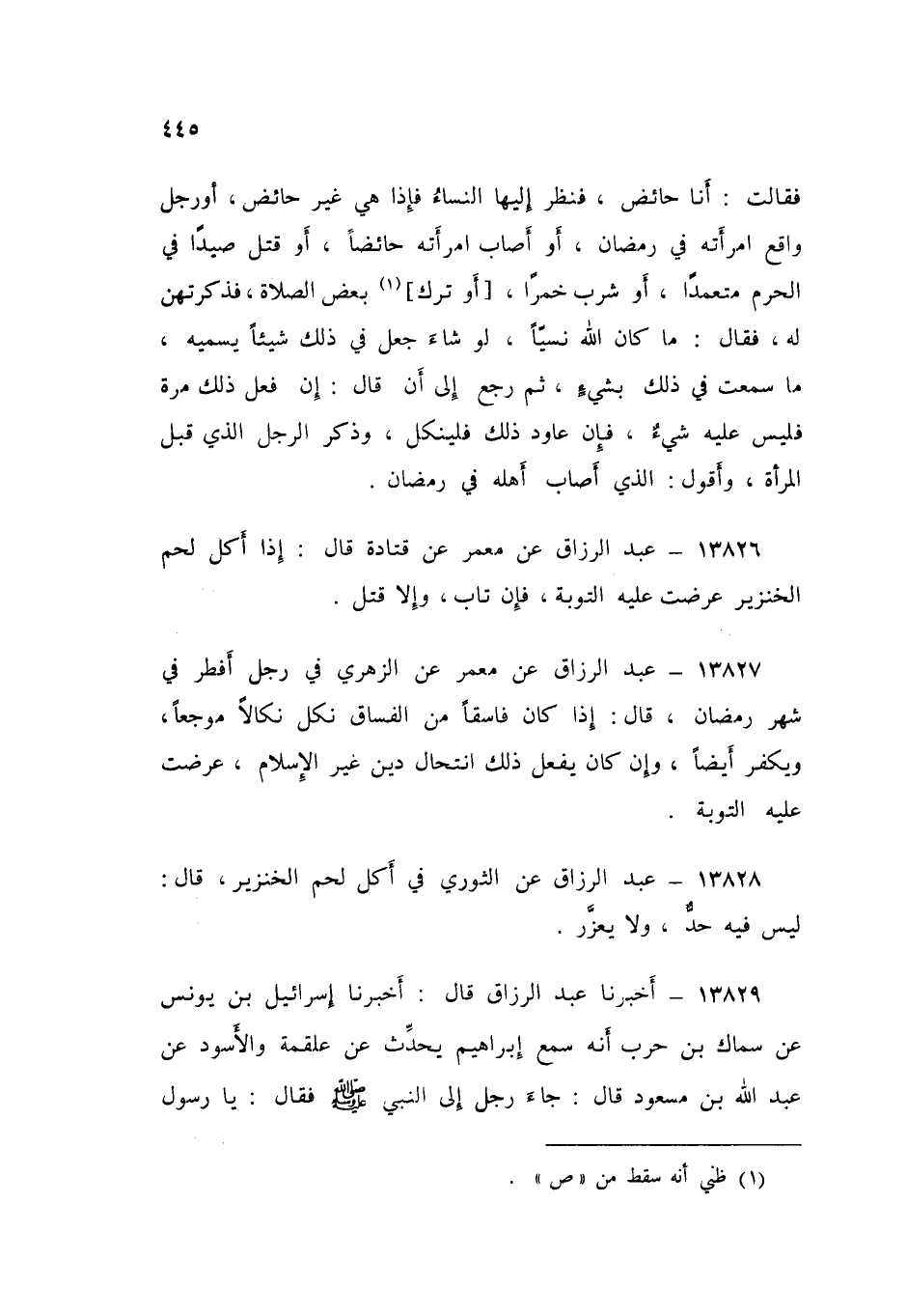 ١٣٨٢٨ - عَنِ الثَّوْرِيِّ فِي أَكْلِ لَحْمِ الْخَنْزِيرِ قَالَ: «لَيْسَ فِيهِ حَدٌّ، وَلَا يُعَزَّرُ»