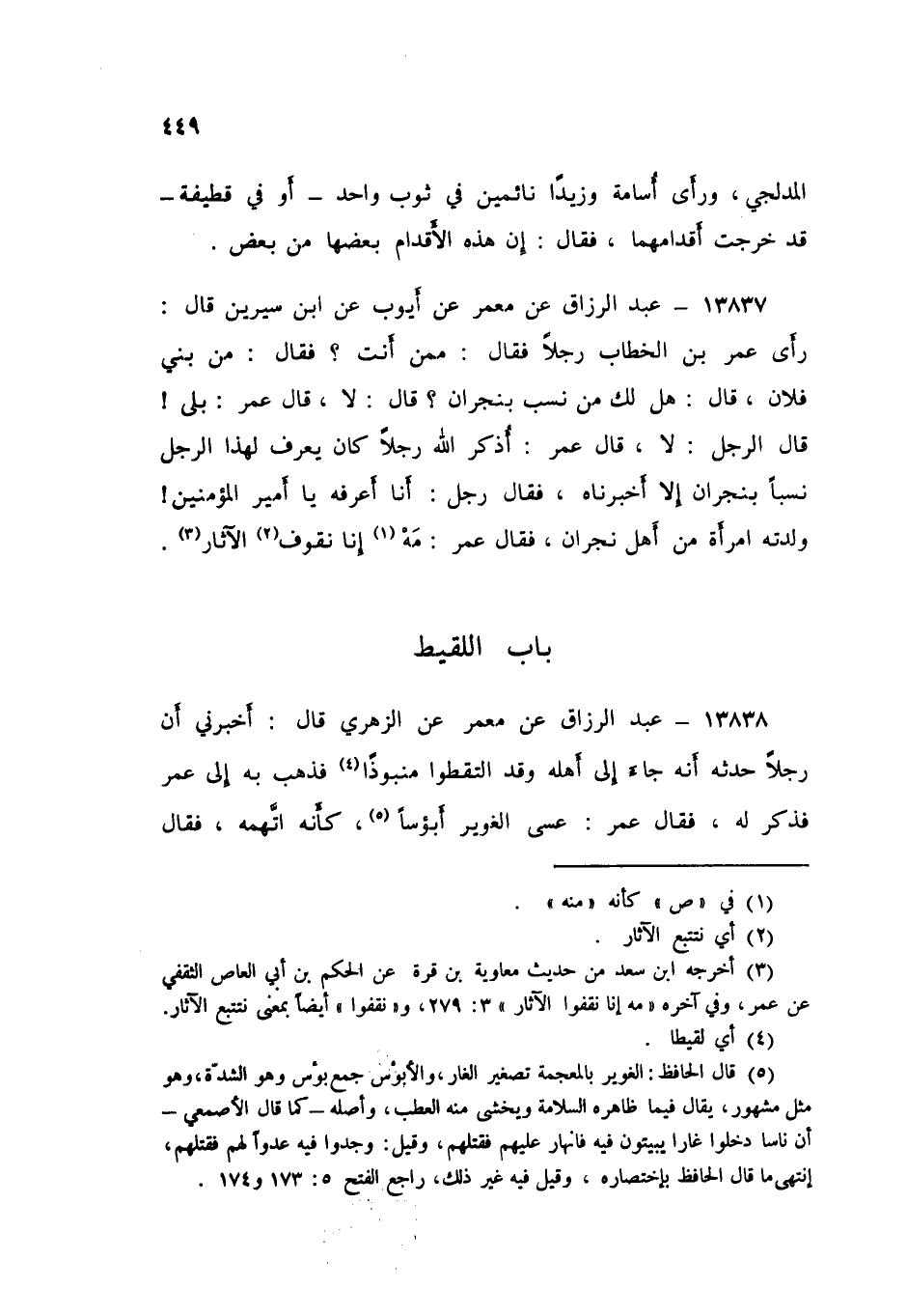 ١٣٨٣٨ - عَنْ مَعْمَرٍ، عَنِ الزُّهْرِيِّ قَالَ: أَخْبَرَنِي أَنَّ رَجُلًا حَدَّثَهُ أنَّهُ جَاءَ إِلَى أَهْلِهِ، وَقَدِ الْتَقَطُوا مَنْبُوذًا، فَذُهِبَ بِهِ إِلَى عُمَرَ فَذُكِرَ لَهُ فَقَالَ عُمَرُ: «عَسَى الْغُوَيْرُ أَبْؤُسًا، كَأَنَّهُ اتَّهَمَهُ»، فَقَالَ الرَّجُلُ: مَا الْتَقَطُوهُ إِلَّا وَأَنَا غَائِبٌ، وَسَأَلَ عَنْهُ عُمَرُ، فَأُثْنِيَ عَلَيْهِ خَيْرًا، فَقَالَ لَهُ عُمَرُ: «فَوَلَاؤُهُ لَكَ، وَنَفَقَتُهُ عَلَيْنَا مِنْ بَيْتِ الْمَالِ». عَبْدُ الرَّزَّاقِ،