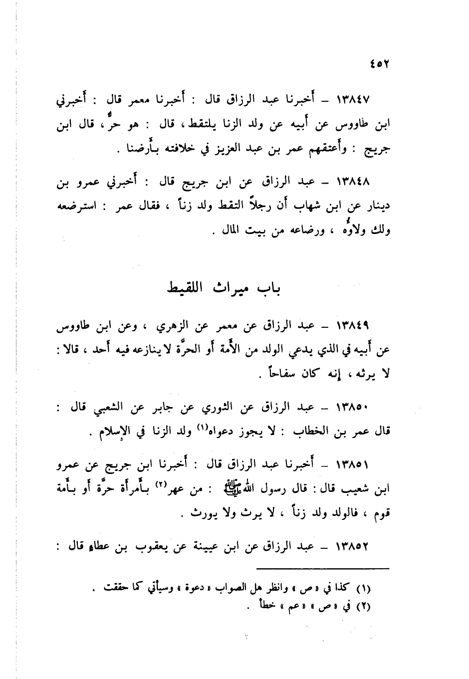 ١٣٨٤٩ - عَنْ مَعْمَرٍ، عَنِ الزُّهْرِيِّ، وَعَنِ ابْنِ طَاوُسٍ، عَنْ أَبِيهِ، فِي الَّذِي يَدِّعِي الْوَلَدَ مِنَ الْأَمَةِ، أَوِ الْحُرَّةِ لَا يُنَازِعُهُ فِيهِ أَحَدٌ، قَالَا: «لَا يَرِثُهُ، إِنَّهُ كَانَ سِفَاحًا»