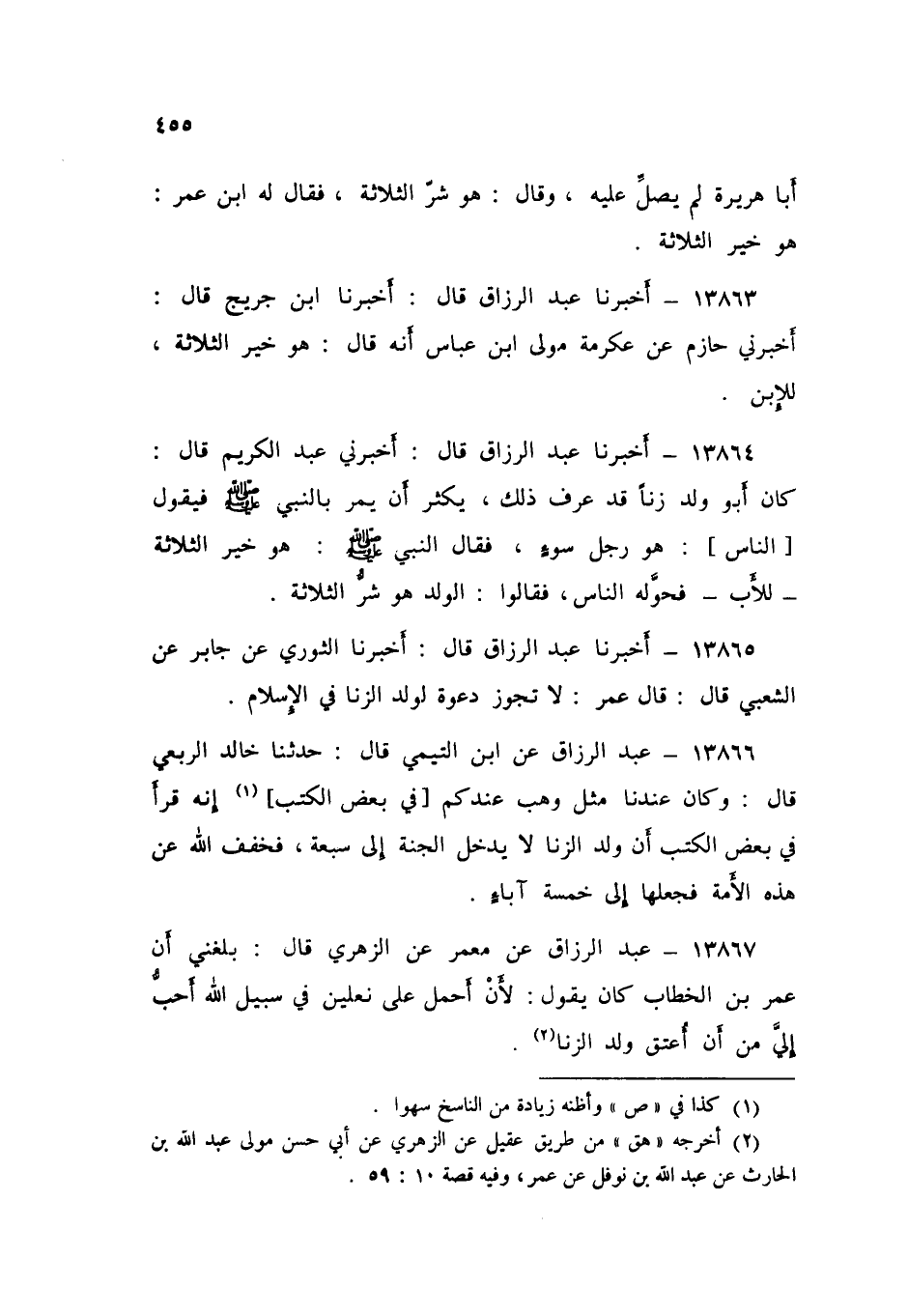 ١٣٨٦٧ - عَنْ مَعْمَرٍ، عَنِ الزُّهْرِيِّ قَالَ: بَلَغَنِي أَنَّ عُمَرَ بْنَ الْخَطَّابِ كَانَ يَقُولُ: «لَأَنْ أُحْمَلَ عَلَى نَعْلَيْنِ فِي سَبِيلِ اللَّهِ أَحَبُّ إِلَيَّ مِنْ أَنْ أَعْتِقَ وَلَدَ الزِّنَا»