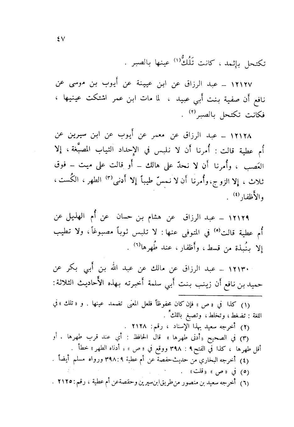 ١٢١٢٨ - عَنْ مَعْمَرٍ، عَنْ أَيُّوبَ، عَنِ ابْنِ سِيرِينَ، عَنْ أُمِّ عَطِيَّةَ قَالَتْ: " أُمْرِنَا أَنْ لَا نَلْبَسَ فِي الْإِحْدَادِ الثِّيَابَ الْمُصْبَغَةَ إِلَّا الْعَصْبَ، وَأُمْرِنَا أَنْ لَا نُحِدَّ عَلَى هَالِكٍ - أَوْ قَالَتْ: عَلَى مَيِّتٍ - فَوْقَ ثَلَاثٍ إِلَّا الزَّوْجَ، وَأُمْرِنَا أَنْ لَا نَمَسَّ طِيبًا إِلَّا أَدْنَى الطُّهْرِ: الْكُسْتُ وَالْأَظْفَارُ "