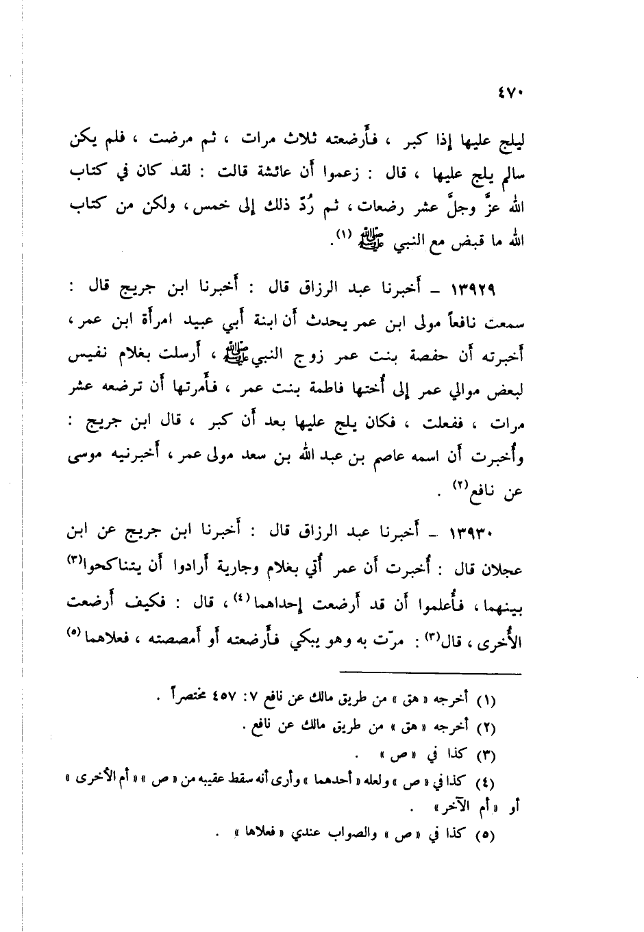١٣٩٣٠ - عَبْدُ الرَّزَّاقِ قَالَ: أَخْبَرَنَا ابْنُ جُرَيْجٍ، عَنِ ابْنِ عَجْلَانَ قَالَ: أُخْبِرْتُ، أَنَّ عُمَرَ أُتِيَ بِغُلَامٍ، وَجَارِيَةٍ أَرَادُوا أَنْ يَتَنَاكَحُوا بَيْنَهُمَا، فَأُعْلِمُوا أَنْ قَدْ أَرْضَعَتْ إِحْدَاهُمَا قَالَ: فَكَيْفَ أَرْضَعَتِ الْأُخْرَى؟ قَالَ: مَرَّتْ بِهِ وَهُوَ يَبْكِي فَأَرْضَعَتْهُ، - أَوْ أَمَصْصَتْهُ -. فَعَلَاهُمَا بِالدِّرَةِ، ثُمَّ قَالَ: «نَاكِحُوا بَيْنَهُمَا، فَإِنَّمَا الرَّضَاعَةُ الْحَضَانَةُ»