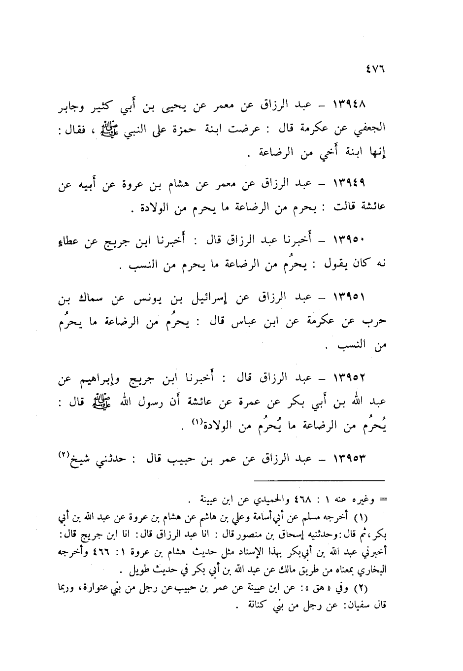 ١٣٩٥٤ - عَبْدُ الرَّزَّاقِ قَالَ: أَخْبَرَنَا ابْنُ جُرَيْجٍ قَالَ: أَخْبَرَنِي مُسْلِمُ بْنُ أَبِي مَرْيَمَ، عَنْ عُرْوَةَ بْنَ الزُّبَيْرِ، عَنْ عَائِشَةَ، أَنَّهَا كَانَتْ تَقُولُ: «يَحْرُمُ مِنَ الرَّضَاعَةِ مَا يَحْرُمُ مِنَ الْوِلَادَةِ»