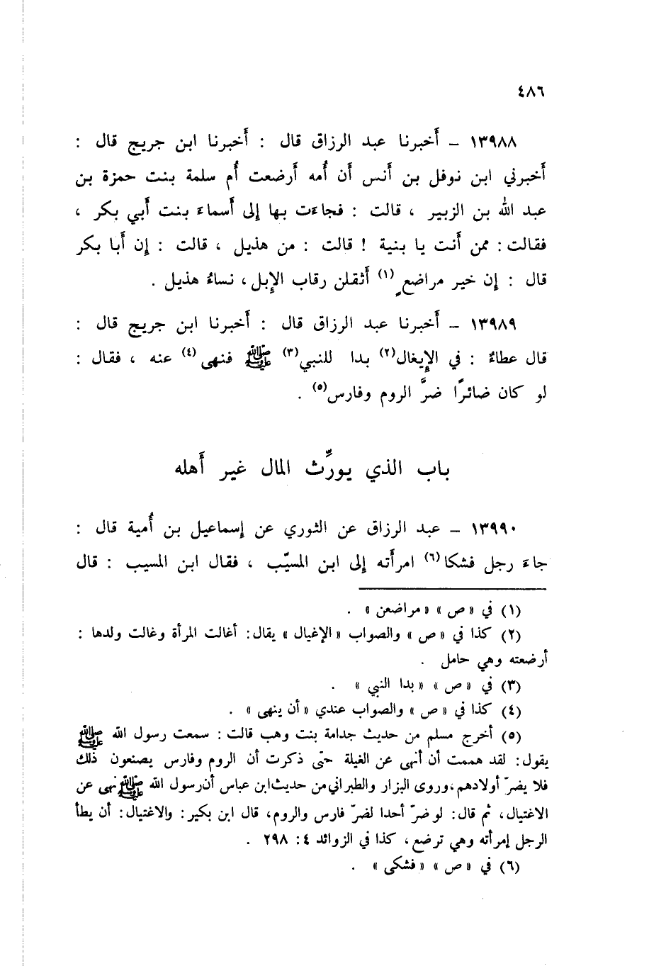 ١٣٩٨٩ - عَبْدُ الرَّزَّاقِ قَالَ: أَخْبَرَنَا ابْنُ جُرَيْجٍ، قَالَ عَطَاءٌ فِي الْإِيغَالِ، بَدَا لِلنَّبِيِّ صَلَّى اللهُ عَلَيْهِ وَسَلَّمَ فَنَهَى عَنْهُ فَقَالَ: «لَوْ كَانَ ضَائِرًا ضَرَّ الرُّومَ وَفَارِسَ»