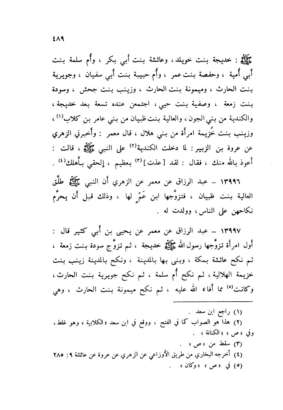 ١٣٩٩٧ - عَنْ مَعْمَرٍ، عَنْ يَحْيَى بْنِ أَبِي كَثِيرٍ قَالَ: " أَوَّلُ امْرَأَةٍ تَزَوَّجَهَا رَسُولُ اللَّهِ صَلَّى اللهُ عَلَيْهِ وَسَلَّمَ: خَدِيجَةُ، ثُمَّ تَزَوَّجَ سَوْدَةَ بِنْتَ زَمْعَةَ، ثُمَّ نَكَحَ عَائِشَةَ بِمَكَّةَ، وَبَنَى بِهَا بِالْمَدِينَةِ، وَنَكَحَ بِالْمَدِينَةِ زَيْنَبَ بِنْتَ خُزَيْمَةَ الْهِلَالِيَّةَ، ثُمَّ نَكَحَ أُمَّ سَلَمَةَ، ثُمَّ نَكَحَ جُويْرِيَّةَ بِنْتَ الْحَارِثِ، وَكَانَتْ مِمَا أَفَاءَ اللَّهُ عَلَيْهِ، ثُمَّ نَكَحَ مَيْمُونَةَ بِنْتَ الْحَارِثِ، وَهِيَ ⦗٤٩٠⦘ الَّتِي وَهَبَتْ نَفْسَهَا لِلنَّبِيِّ صَلَّى اللهُ عَلَيْهِ وَسَلَّمَ، ثُمَّ نَكَحَ صَفِيَّةَ بِنْتَ حُيَيٍّ وَهِيَ مِمَّا أَفَاءَ اللَّهُ عَلَيْهِ يَوْمَ خَيْبَرَ، ثُمَّ نَكَحَ زَيْنَبَ بِنْتَ جَحْشٍ، وَكَانَتِ امْرَأَةَ زَيْدِ بْنِ حَارِثَةَ، وَتُوفِّيتْ زَيْنَبُ بِنْتُ خُزَيْمَةَ عِنْدَ النَّبِيِّ صَلَّى اللهُ عَلَيْهِ وَسَلَّمَ، وَخَدِيجَةُ أَيْضًا تُوُفِّيَتْ بِمَكَّةَ، وَنَكَحَ امْرَأَةً مِنْ بَنِي كِلَابِ بْنِ رَبِيعَةَ يُقَالُ لَهَا: الْعَالِيَةُ بِنْتُ ظَيْبَانَ فَطَلَّقَهَا حِينَ أُدْخِلَتْ عَلَيْهِ، وَجُويْرِيَةُ مِنْ بَنِي الْمُصْطَلِقِ مِنْ خُزَاعَةَ، وَحَفْصَةُ، وَأُمُّ حَبِيبَةَ، وَامْرَأَةٌ مِنْ كَلْبٍ فَكَانَ جَمِيعُ مَا تَزَوَّجَ أَرْبَعَ عَشْرَةَ مِنْهُنَّ الْكِنْدِيَّةَ "