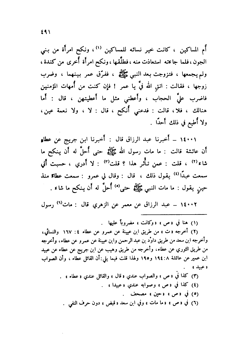 ١٤٠٠١ - عَبْدُ الرَّزَّاقِ، أَخْبَرَنَا ابْنُ جُرَيْجٍ، عَنْ عَطَاءٍ، أَنَّ عَائِشَةَ قَالَتْ: «مَا مَاتَ رَسُولُ اللَّهِ صَلَّى اللهُ عَلَيْهِ وَسَلَّمَ، حَتَّى أُحِلَّ لَهُ أَنْ يَنْكِحَ مَا شَاءَ». قُلْتُ: عَمَّنْ تَأْثِرُ هَذَا؟ قُلْتُ: لَا أَدْرِي، حَسِبْتُ أَنِّي سَمِعْتُ عَبْدًا يَقُولُ ذَلِكَ. قَالَ: وَقَالَ لِي عَمْرٌو سَمِعْتُ عَطَاءً مُنْذُ حِينٍ يَقُولُ: «مَا مَاتَ النَّبِيُّ صَلَّى اللهُ عَلَيْهِ وَسَلَّمَ حَتَّى أُحِلَّ لَهُ أَنْ يَنْكِحَ مَا شَاءَ»