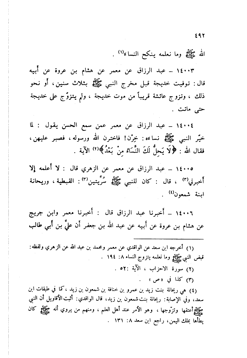 ١٤٠٠٧ - عَنْ مَعْمَرٍ قَالَ: سَمِعْتُ الزُّهْرِي يَقُولُ: لَمْ يَتَزَوَّجِ النَّبِيُّ صَلَّى اللهُ عَلَيْهِ وَسَلَّمَ عَلَى خَدِيجَةَ حَتَّى مَاتَتْ، وَقَالَتْ عَائِشَةُ: «مَا رَأَيْتُ خَدِيجَةَ قَطُّ، وَمَا غِرْتُ عَلَى امْرَأَةٍ قَطُّ أَشَدَّ مِنْ غَيْرَتِي عَلَى خَدِيجَةَ، وَذَلِكَ مِنْ كَثْرَةِ مَا كَانَ يَذْكُرُهَا»