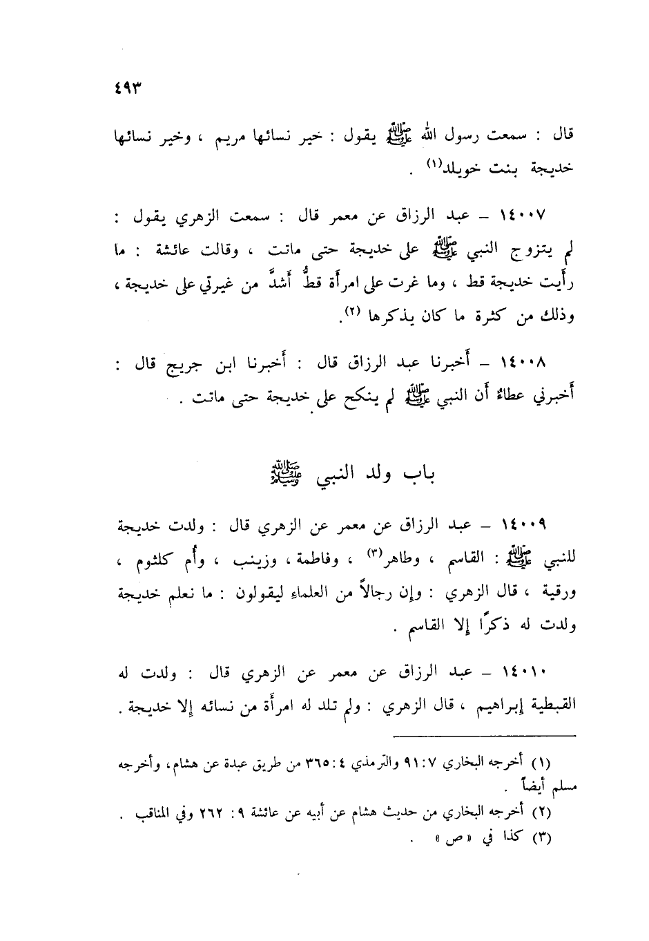 ١٤٠٠٩ - عَنْ مَعْمَرٍ، عَنِ الزُّهْرِيِّ قَالَ: «وَلَدتْ خَدِيجَةُ لِلنَّبِيِّ صَلَّى اللهُ عَلَيْهِ وَسَلَّمَ الْقَاسِمَ، وَطَاهِرًا، وَفَاطِمَةَ وَزَيْنَبَ، وَأُمَّ كُلْثُومٍ، وَرُقَيَّةَ». قَالَ الزُّهْرِي: وَإِنَّ رِجَالًا مِنَ الْعُلَمَاءِ لَيَقُولُونَ: «مَا نَعْلَمُ خَدِيجَةَ وَلَدَتْ لَهُ ذَكَرًا إِلَّا الْقَاسِمَ»