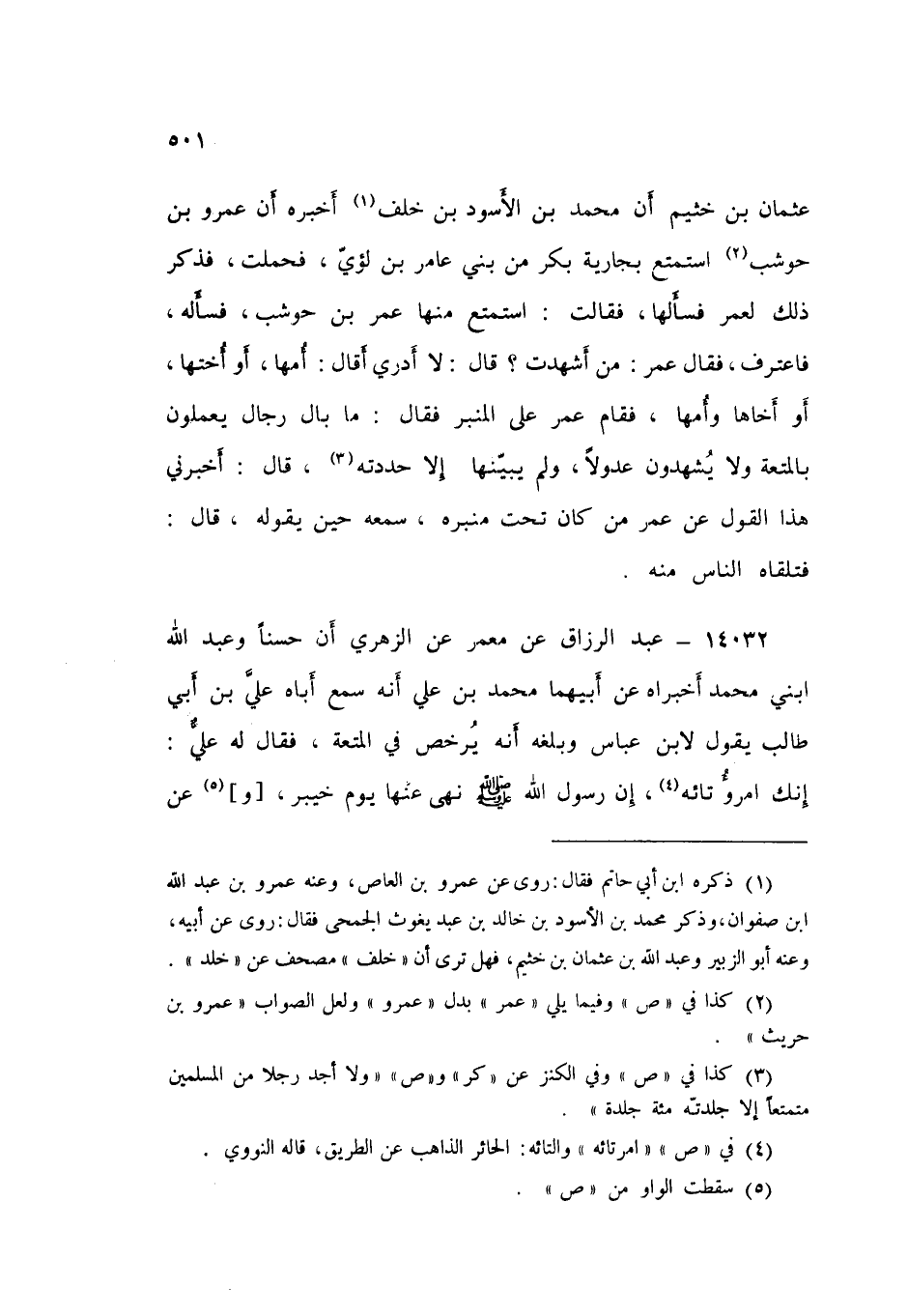 ١٤٠٣٣ - عَنْ مَعْمَرٍ قَالَ: أَخْبَرَنِي الزُّهْرِي، عَنْ خَالِدِ بْنِ الْمُهَاجِرِ بْنِ خَالِدٍ قَالَ: أَرْخَصَ ابْنُ عَبَّاسٍ فِي الْمُتْعَةِ، فَقَالَ لَهُ ابْنُ أَبِي عَمْرَةَ الْأَنْصَارِيُّ: «مَا هَذَا يَا أَبَا عَبَّاسٍ؟» فَقَالَ ابْنُ عَبَّاسٍ: فُعِلَتْ مَعَ إِمَامِ الْمُتَّقِينَ. فَقَالَ ابْنُ أَبِي عَمْرَةَ: «اللَّهُمَّ غُفْرًا، إِنَّمَا كَانَتِ الْمُتْعَةُ رُخْصَةً كَالضُّرُورَةِ إِلَى الْمَيْتَةِ، وَالدَّمِ، وَلَحْمِ الْخِنْزِيرِ، ثُمَّ أَحْكَمَ اللَّهُ تَعَالَى الدِّينَ بَعْدُ»
