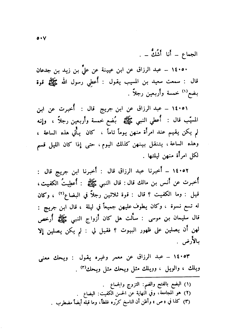 ١٤٠٥٢ - عَبْدُ الرَّزَّاقِ قَالَ: أَخْبَرَنَا ابْنُ جُرَيْجٍ قَالَ: أُخْبِرْتُ، عَنْ أَنَسِ بْنِ مَالِكٍ قَالَ: قَالَ النَّبِيُّ صَلَّى اللهُ عَلَيْهِ وَسَلَّمَ: «أُعْطِيتُ الْكَفِيتُ» قِيلَ وَمَا الْكَفِيتُ؟ قَالَ: «قُوَّةُ ثَلَاثِينَ رَجُلًا فِي الْبُضَاعِ» وَكَانَ لَهُ تِسْعُ نِسْوَةٍ وَكَانَ يَطُوفُ عَلَيْهِنَّ جَمِيعًا فِي لَيْلَةٍ ". قَالَ ابْنُ جُرَيْجٍ: قَالَ سُلَيْمَانُ بْنُ مُوسَى: سَأَلْتُ هَلْ كَانَ أَزْوَاجُ النَّبِيِّ صَلَّى اللهُ عَلَيْهِ وَسَلَّمَ أُرْخِصَ لَهُنَّ أَنْ يُصَلِّينَ عَلَى ظُهُورِ الْبُيُوتِ؟ فَقِيلَ لِي: لَمْ يَكُنَّ يُصَلِّينَ إِلَّا بِالْأَرْضِ