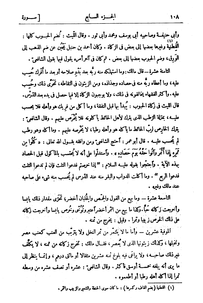 وأبي حنيفة وصاحبيه أبي يوسف ومحمد وأبي ثَوْرٍ. وَقَالَ اللَّيْثُ: تُضَمُّ الْحُبُوبُ كُلُّهَا: الْقُطْنِيَّةُ «١» وَغَيْرُهَا بَعْضُهَا إِلَى بَعْضٍ فِي الزَّكَاةِ. وَكَانَ أَحْمَدُ بْنُ حَنْبَلٍ يَجْبُنُ عَنْ ضَمِّ الذَّهَبِ إِلَى الْوَرِقِ، وَضَمِّ الْحُبُوبِ بَعْضِهَا إِلَى بَعْضٍ، ثُمَّ كَانَ فِي آخِرِ أَمْرِهِ يَقُولُ فِيهَا بِقَوْلِ الشَّافِعِيِّ. الثَّامِنَةَ عَشْرَةَ- قَالَ مَالِكٌ: وَمَا اسْتَهْلَكَهُ مِنْهُ رَبُّهُ بَعْدَ بُدُوِّ صَلَاحِهِ أَوْ بعد ما أَفَرَكَ حُسِبَ عَلَيْهِ، وَمَا أَعْطَاهُ رَبُّهُ مِنْهُ فِي حَصَادِهِ وَجَذَاذِهِ، وَمِنَ الزَّيْتُونِ فِي الْتِقَاطِهِ، تَحَرَّى ذَلِكَ وَحُسِبَ عَلَيْهِ. وَأَكْثَرُ الْفُقَهَاءِ يُخَالِفُونَهُ فِي ذَلِكَ، وَلَا يُوجِبُونَ الزَّكَاةَ إِلَّا فِيمَا حَصَلَ فِي يَدِهِ بَعْدَ الدَّرْسِ. قَالَ اللَّيْثُ فِي زَكَاةِ الْحُبُوبِ: يَبْدَأُ بِهَا قَبْلَ النَّفَقَةِ، وَمَا أَكَلَ مِنْ فَرِيكٍ هُوَ وَأَهْلُهُ فَلَا يحسب عليه، بمنزلة الَّذِي يُتْرَكُ لِأَهْلِ الْحَائِطِ يَأْكُلُونَهُ فَلَا يُخْرَصُ عَلَيْهِمْ. وَقَالَ الشَّافِعِيُّ: يَتْرُكُ الْخَارِصُ لِرَبِّ الْحَائِطِ مَا يَأْكُلُهُ هُوَ وَأَهْلُهُ رُطَبًا، لَا يَخْرُصُهُ عَلَيْهِمْ. وَمَا أَكَلَهُ وَهُوَ رُطَبٌ لَمْ يُحْسَبْ عَلَيْهِ. قَالَ أَبُو عُمَرَ: احْتَجَّ الشَّافِعِيُّ وَمَنْ وَافَقَهُ بِقَوْلِ اللَّهِ تَعَالَى:" كُلُوا مِنْ ثَمَرِهِ إِذا أَثْمَرَ وَآتُوا حَقَّهُ يَوْمَ حَصادِهِ". وَاسْتَدَلُّوا عَلَى أَنَّهُ لَا يُحْتَسَبُ بِالْمَأْكُولِ قَبْلَ الْحَصَادِ بهذه الآية. واحتجوا بقول عَلَيْهِ السَّلَامُ: (إِذَا خَرَصْتُمْ فَدَعُوا الثُّلُثَ فَإِنْ لَمْ تَدَعُوا الثُّلُثَ فَدَعُوا الرُّبُعَ). وَمَا أَكَلَتِ الدَّوَابُّ وَالْبَقَرُ مِنْهُ عِنْدَ الدَّرْسِ لَمْ يُحْسَبْ منه شي عَلَى صَاحِبِهِ عِنْدَ مَالِكٍ وَغَيْرِهِ. التَّاسِعَةَ- عَشْرَةَ- وَمَا بِيعَ مِنَ الْفُولِ وَالْحِمَّصِ وَالْجُلْبَانِ أَخْضَرَ، تَحَرَّى مِقْدَارَ ذَلِكَ يَابِسًا وَأُخْرِجَتْ زَكَاتُهُ حَبًّا. وَكَذَا مَا بِيعَ مِنَ الثَّمَرِ أَخْضَرَ اعْتُبِرَ وَتُوُخِّيَ وَخُرِصَ يَابِسًا وَأُخْرِجَتْ زَكَاتُهُ عَلَى ذَلِكَ الْخَرْصِ زَبِيبًا وَتَمْرًا. وَقِيلَ: يُخْرَجُ مِنْ ثَمَنِهِ. الْمُوَفِّيَةُ عِشْرِينَ- وَأَمَّا مَا لَا يَتَتَمَّرُ مِنْ ثَمَرِ النَّخْلِ وَلَا يَتَزَبَّبُ مِنَ الْعِنَبِ كَعِنَبِ مِصْرَ (وَبَلَحِهَا) ٢ (، وَكَذَلِكَ زَيْتُونُهَا الَّذِي لَا يُعْصَرُ، فَقَالَ مَالِكٌ: تُخْرَجُ زَكَاتُهُ مِنْ ثَمَنِهِ، لَا يُكَلَّفُ غَيْرَ ذَلِكَ صَاحِبُهُ، وَلَا يُرَاعَى فِيهِ بُلُوغُ ثَمَنِهِ عِشْرِينَ مِثْقَالًا أَوْ مِائَتَيْ دِرْهَمٍ، وَإِنَّمَا يُنْظَرُ إِلَى مَا يَرَى أَنَّهُ يَبْلُغُهُ خَمْسَةَ أَوْسُقٍ فَأَكْثَرَ. وَقَالَ الشَّافِعِيُّ: (يُخْرِجُ «٢» عُشْرَهُ أَوْ نِصْفَ عُشْرِهِ مِنْ وَسَطِهِ تَمْرًا إِذَا أكله أهله رطبا أو أطعموه.