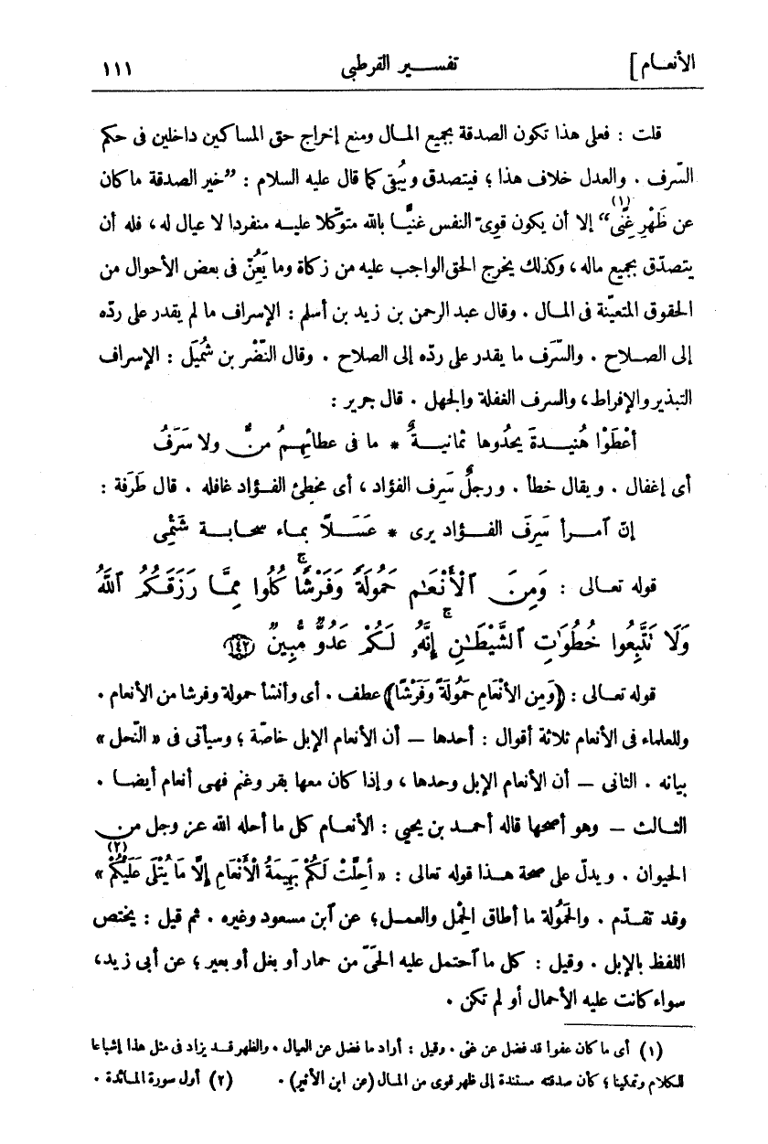 قُلْتُ: فَعَلَى هَذَا تَكُونُ الصَّدَقَةُ بِجَمِيعِ الْمَالِ وَمِنْهُ إِخْرَاجُ حَقِّ الْمَسَاكِينِ دَاخِلَيْنِ، فِي حُكْمِ السَّرَفِ، وَالْعَدْلُ خِلَافُ هَذَا، فَيَتَصَدَّقُ وَيُبْقِي كَمَا قَالَ عَلَيْهِ السَّلَامُ: (خَيْرُ الصَّدَقَةِ مَا كَانَ عَنْ ظَهْرِ غِنًى «١» إِلَّا أَنْ يَكُونَ قَوِيَّ النَّفْسِ غَنِيًّا بِاللَّهِ مُتَوَكِّلًا عَلَيْهِ مُنْفَرِدًا لَا عِيَالَ لَهُ، فَلَهُ أَنْ يَتَصَدَّقَ بِجَمِيعِ مَالِهِ، وَكَذَلِكَ يُخْرِجُ الْحَقَّ الْوَاجِبَ عَلَيْهِ مِنْ زَكَاةٍ وَمَا يَعِنُّ فِي بَعْضِ الْأَحْوَالِ مِنَ الْحُقُوقِ الْمُتَعَيِّنَةِ فِي الْمَالِ. وَقَالَ عَبْدُ الرَّحْمَنِ بْنُ زَيْدِ بْنِ أَسْلَمَ: الْإِسْرَافُ مَا لَمْ يَقْدِرْ عَلَى رَدِّهِ إِلَى الصَّلَاحِ. وَالسَّرَفُ مَا يَقْدِرُ عَلَى رَدِّهِ إِلَى الصَّلَاحِ. وَقَالَ النَّضْرُ بْنُ شُمَيْلٍ: الْإِسْرَافُ التَّبْذِيرُ وَالْإِفْرَاطُ، وَالسَّرَفُ الْغَفْلَةُ وَالْجَهْلُ. قَالَ جَرِيرٌ: