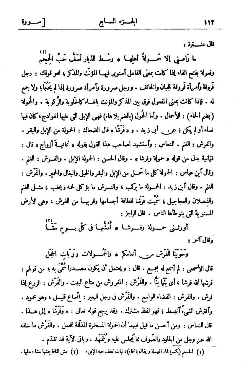 وَفَعُولَةٌ بِفَتْحِ الْفَاءِ إِذَا كَانَتْ بِمَعْنَى الْفَاعِلِ اسْتَوَى فِيهَا الْمُؤَنَّثُ وَالْمُذَكَّرُ، نَحْوَ قَوْلِكَ: رَجُلٌ فَرُوقَةٌ وَامْرَأَةٌ فَرُوقَةٌ لِلْجَبَانِ وَالْخَائِفِ. وَرَجُلٌ صَرُورَةٌ وَامْرَأَةٌ صَرُورَةٌ إِذَا لَمْ يَحُجَّا، وَلَا جَمْعَ لَهُ. فَإِذَا كَانَتْ بِمَعْنَى الْمَفْعُولِ فُرِّقَ بَيْنَ الْمُذَكَّرِ وَالْمُؤَنَّثِ بِالْهَاءِ كَالْحَلُوبَةِ وَالرَّكُوبَةِ. وَالْحُمُولَةُ (بِضَمِّ الْحَاءِ): الْأَحْمَالُ. وَأَمَّا الْحُمُولُ (بِالضَّمِّ بِلَا هَاءٍ) فَهِيَ الْإِبِلُ الَّتِي عَلَيْهَا الْهَوَادِجُ، كَانَ فِيهَا نِسَاءٌ أَوْ لَمْ يَكُنْ، عَنْ أَبِي زَيْدٍ." وَفَرْشاً" قَالَ الضَّحَّاكُ: الْحَمُولَةُ مِنَ الْإِبِلِ وَالْبَقَرِ. وَالْفَرْشُ: الْغَنَمُ. النحاس: واستشهد لصاحب هذا القول بقول:" ثَمانِيَةَ أَزْواجٍ" قَالَ: فَ" ثَمانِيَةَ" بَدَلٌ مِنْ قَوْلِهِ:" حَمُولَةً وَفَرْشاً". وَقَالَ الْحَسَنُ: الْحَمُولَةُ الْإِبِلُ. وَالْفَرْشُ: الْغَنَمُ. وَقَالَ ابْنُ عَبَّاسٍ: الْحَمُولَةُ كُلُّ مَا حَمَلَ مِنَ الْإِبِلِ وَالْبَقَرِ وَالْخَيْلِ وَالْبِغَالِ وَالْحَمِيرِ. وَالْفَرْشُ: الْغَنَمُ. وَقَالَ ابْنُ زَيْدٍ: الْحَمُولَةُ ما يركب، والفرش ما يؤكل لحمه ومحلب، مِثْلَ الْغَنَمِ وَالْفِصْلَانِ وَالْعَجَاجِيلِ، سُمِّيَتْ فَرْشًا لِلَطَافَةِ أَجْسَامِهَا وَقُرْبِهَا مِنَ الْفَرْشِ، وَهِيَ الْأَرْضُ الْمُسْتَوِيَةُ الَّتِي يَتَوَطَّؤُهَا النَّاسُ. قَالَ الرَّاجِزُ: