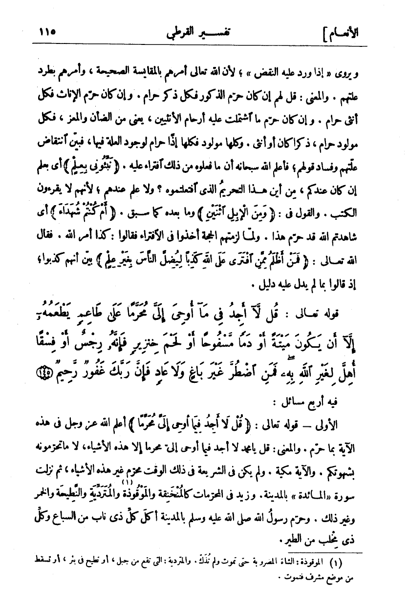 قُلْ لَا أَجِدُ فِي مَا أُوحِيَ إِلَيَّ مُحَرَّماً عَلى طاعِمٍ يَطْعَمُهُ إِلاَّ أَنْ يَكُونَ مَيْتَةً أَوْ دَماً مَسْفُوحاً أَوْ لَحْمَ خِنزِيرٍ فَإِنَّهُ رِجْسٌ أَوْ فِسْقاً أُهِلَّ لِغَيْرِ اللَّهِ بِهِ فَمَنِ اضْطُرَّ غَيْرَ باغٍ وَلا عادٍ فَإِنَّ رَبَّكَ غَفُورٌ رَحِيمٌ (١٤٥)