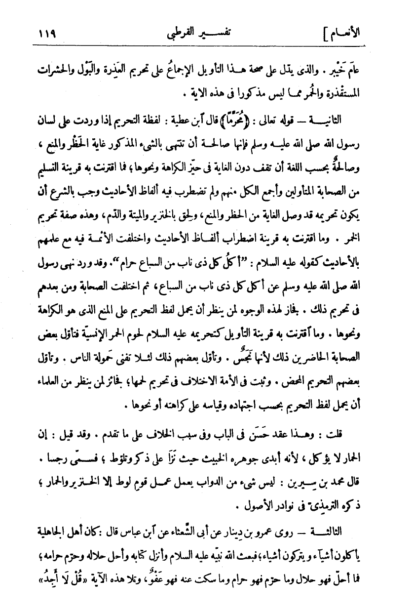 عَامَ خَيْبَرَ. وَالَّذِي يَدُلُّ عَلَى صِحَّةِ هَذَا التَّأْوِيلِ الْإِجْمَاعُ عَلَى تَحْرِيمِ الْعَذِرَةِ وَالْبَوْلِ وَالْحَشَرَاتِ الْمُسْتَقْذَرَةِ وَالْحُمُرِ مِمَّا لَيْسَ مَذْكُورًا فِي هَذِهِ الْآيَةِ. الثَّانِيَةُ- قَوْلُهُ تَعَالَى:" مُحَرَّماً" قَالَ ابْنُ عَطِيَّةَ: لَفْظَةُ التَّحْرِيمِ إِذَا وَرَدَتْ عَلَى لِسَانِ رَسُولِ اللَّهِ صَلَّى اللَّهُ عَلَيْهِ وَسَلَّمَ فَإِنَّهَا صَالِحَةٌ أَنْ تَنْتَهِيَ بِالشَّيْءِ الْمَذْكُورِ غَايَةَ الْحَظْرِ وَالْمَنْعِ، وَصَالِحَةٌ (أَيْضًا) ١ بِحَسَبِ اللُّغَةِ أَنْ تَقِفَ دُونَ الْغَايَةِ فِي حَيِّزِ الْكَرَاهَةِ وَنَحْوِهَا، فَمَا اقْتَرَنَتْ بِهِ قَرِينَةُ التَّسْلِيمِ مِنَ الصَّحَابَةِ الْمُتَأَوِّلِينَ وَأَجْمَعَ الْكُلُّ مِنْهُمْ وَلَمْ تَضْطَرِبْ فِيهِ أَلْفَاظُ الْأَحَادِيثِ وَجَبَ بِالشَّرْعِ أَنْ يَكُونَ تَحْرِيمُهُ قَدْ وَصَلَ الْغَايَةَ مِنَ الْحَظْرِ وَالْمَنْعِ، وَلَحِقَ بِالْخِنْزِيرِ وَالْمَيْتَةِ وَالدَّمِ، وَهَذِهِ صِفَةُ تَحْرِيمِ الْخَمْرِ. وَمَا اقْتَرَنَتْ بِهِ قَرِينَةُ اضْطِرَابِ أَلْفَاظِ الْأَحَادِيثِ وَاخْتَلَفَتِ الْأَئِمَّةُ فِيهِ مَعَ عِلْمِهِمْ بِالْأَحَادِيثِ كَقَوْلِهِ عَلَيْهِ السَّلَامُ: (أَكْلُ كُلِّ ذِي نَابٍ مِنَ السِّبَاعِ حَرَامٌ). وَقَدْ وَرَدَ نَهَى رَسُولُ اللَّهِ صَلَّى اللَّهُ عَلَيْهِ وَسَلَّمَ عَنْ أَكْلِ كُلِّ ذِي نَابٍ مِنَ السِّبَاعِ، ثُمَّ اخْتَلَفَتِ الصَّحَابَةُ وَمَنْ بَعْدَهُمْ فِي تَحْرِيمِ ذَلِكَ، فَجَازَ لِهَذِهِ الْوُجُوهِ لِمَنْ يَنْظُرُ أَنْ يَحْمِلَ لَفْظَ التَّحْرِيمِ عَلَى الْمَنْعِ الَّذِي هُوَ الْكَرَاهَةُ وَنَحْوُهَا. وَمَا اقْتَرَنَتْ بِهِ قَرِينَةُ التَّأْوِيلِ كَتَحْرِيمِهِ عَلَيْهِ السَّلَامُ لُحُومَ الْحُمُرِ الْإِنْسِيَّةِ فَتَأَوَّلَ بَعْضُ الصَّحَابَةِ الْحَاضِرِينَ ذَلِكَ لِأَنَّهُ نَجِسٌ، وَتَأَوَّلَ بَعْضُهُمْ ذَلِكَ لِئَلَّا تَفْنَى حَمُولَةُ النَّاسِ، وَتَأَوَّلَ بَعْضُهُمُ التَّحْرِيمَ الْمَحْضَ. وَثَبَتَ فِي الْأُمَّةِ الِاخْتِلَافُ فِي تَحْرِيمِ لَحْمِهَا، فَجَائِزٌ لِمَنْ يَنْظُرُ مِنَ الْعُلَمَاءِ أَنْ يَحْمِلَ لَفْظَ التَّحْرِيمِ عَلَى الْمَنْعِ الَّذِي هُوَ الْكَرَاهَةُ وَنَحْوُهَا نحوها «١» (بِحَسَبِ اجْتِهَادِهِ وَقِيَاسِهِ. قُلْتُ: وَهَذَا عَقْدٌ حَسَنٌ فِي هَذَا الْبَابِ وَفِي سَبَبِ الْخِلَافِ عَلَى مَا تَقَدَّمَ. وَقَدْ قِيلَ: إِنَّ الْحِمَارَ لَا يُؤْكَلُ، لِأَنَّهُ أَبْدَى جَوْهَرَهُ الْخَبِيثَ حَيْثُ نَزَا عَلَى ذَكَرٍ وَتَلَوَّطَ، فَسُمِّيَ رِجْسًا. قَالَ مُحَمَّدُ بن سيرين: ليس شي مِنَ الدَّوَابِّ يَعْمَلُ عَمَلَ قَوْمِ لُوطٍ إِلَّا الْخِنْزِيرَ وَالْحِمَارَ، ذَكَرَهُ التِّرْمِذِيُّ فِي نَوَادِرِ الْأُصُولِ. الثَّالِثَةُ- رَوَى عَمْرُو بْنُ دِينَارٍ عَنْ أَبِي الشَّعْثَاءِ عَنِ ابْنِ عَبَّاسٍ قَالَ: كَانَ أَهْلُ الْجَاهِلِيَّةِ يَأْكُلُونَ أَشْيَاءَ وَيَتْرُكُونَ أَشْيَاءَ، فَبَعَثَ اللَّهُ نَبِيَّهُ عَلَيْهِ السَّلَامُ وَأَنْزَلَ كِتَابَهُ وَأَحَلَّ حَلَالَهُ وَحَرَّمَ حَرَامَهُ، فَمَا أَحَلَّ فَهُوَ حَلَالٌ وَمَا حَرَّمَ فَهُوَ حَرَامٌ وَمَا سَكَتَ عَنْهُ فَهُوَ عفو، وتلا هذه الآية