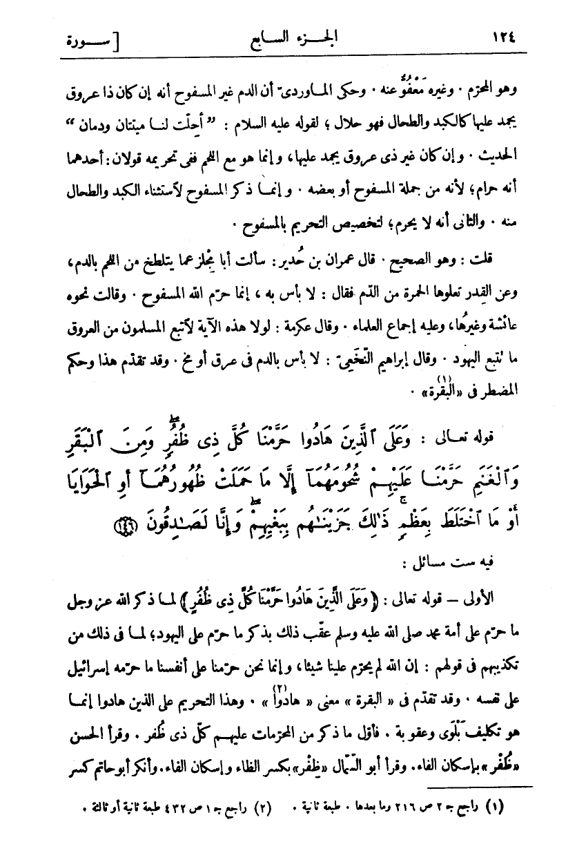 فِيهِ سِتُّ مَسَائِلَ: الْأُولَى- قَوْلِهِ تَعَالَى: (وَعَلَى الَّذِينَ هادُوا حَرَّمْنا كُلَّ ذِي ظُفُرٍ) لَمَّا ذَكَرَ اللَّهُ عَزَّ وَجَلَّ مَا حَرَّمَ عَلَى أُمَّةِ مُحَمَّدٍ صَلَّى اللَّهُ عَلَيْهِ وَسَلَّمَ عَقَّبَ ذَلِكَ بِذِكْرِ مَا حَرَّمَ عَلَى الْيَهُودِ، لِمَا فِي ذَلِكَ مِنْ تَكْذِيبِهِمْ فِي قَوْلِهِمْ: إِنَّ اللَّهَ لَمْ يُحَرِّمْ عَلَيْنَا شَيْئًا، وَإِنَّمَا نَحْنُ حَرَّمْنَا عَلَى أَنْفُسِنَا مَا حَرَّمَهُ إِسْرَائِيلُ عَلَى نَفْسِهِ. وَقَدْ تَقَدَّمَ فِي الْبَقَرَةِ مَعْنَى (هَادُوا «٣». وَهَذَا التَّحْرِيمُ عَلَى الَّذِينَ هَادُوا إِنَّمَا هُوَ تَكْلِيفُ بَلْوَى وَعُقُوبَةٍ. فَأَوَّلُ مَا ذُكِرَ مِنَ الْمُحَرَّمَاتِ عَلَيْهِمْ كُلُّ ذِي ظُفُرٍ. وَقَرَأَ الْحَسَنُ" ظُفْرٍ" بِإِسْكَانِ الْفَاءِ. وَقَرَأَ أَبُو السِّمَالِ" ظِفْرٍ" بِكَسْرِ الظَّاءِ وَإِسْكَانِ الْفَاءِ. وَأَنْكَرَ أَبُو حَاتِمٍ كسر