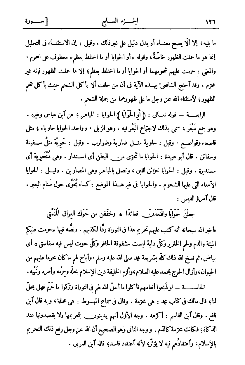 الشَّيْءُ عَلَى مَا يَلِيهِ، إِلَّا أَلَّا يَصِحَّ مَعْنَاهُ أَوْ يَدُلَّ دَلِيلٌ عَلَى غَيْرِ ذَلِكَ. وَقِيلَ: إِنَّ الِاسْتِثْنَاءَ فِي التَّحْلِيلِ إِنَّمَا هُوَ مَا حَمَلَتِ الظُّهُورُ خَاصَّةً، وَقَوْلُهُ:" أَوِ الْحَوايا أَوْ مَا اخْتَلَطَ بِعَظْمٍ" مَعْطُوفٌ عَلَى الْمُحَرَّمِ. وَالْمَعْنَى: حُرِّمَتْ عَلَيْهِمْ شُحُومُهُمَا أَوِ الْحَوَايَا أَوْ مَا اخْتَلَطَ بِعَظْمٍ، إِلَّا مَا حَمَلَتِ الظُّهُورُ فَإِنَّهُ غَيْرُ مُحَرَّمٍ. وَقَدِ احْتَجَّ الشَّافِعِيُّ بِهَذِهِ الْآيَةِ فِي أَنَّ مَنْ حَلَفَ أَلَّا يَأْكُلَ الشَّحْمَ حَنِثَ بِأَكْلِ شَحْمِ الظُّهُورِ، لِاسْتِثْنَاءِ اللَّهِ عَزَّ وَجَلَّ مَا عَلَى ظُهُورِهِمَا مِنْ جُمْلَةِ الشَّحْمِ. الرَّابِعَةُ- قَوْلُهُ تَعَالَى: (أَوِ الْحَوايا): الْحَوَايَا: هِيَ الْمَبَاعِرُ، عَنِ ابْنِ عَبَّاسٍ وَغَيْرِهِ. وَهُوَ جَمْعُ مَبْعَرٍ، سُمِّيَ بِذَلِكَ لِاجْتِمَاعِ الْبَعْرِ فِيهِ. وَهُوَ الزِّبْلُ. وَوَاحِدُ الْحَوَايَا حَاوِيَاءُ، مِثْلَ قَاصِعَاءَ وَقَوَاصِعَ. وَقِيلَ: حَاوِيَةٌ مِثْلُ ضَارِبَةٍ وَضَوَارِبَ. وَقِيلَ: حَوِيَّةٌ مِثْلُ سَفِينَةٍ وَسَفَائِنَ. قَالَ أَبُو عُبَيْدَةَ: الْحَوَايَا مَا تَحَوَّى مِنَ الْبَطْنِ أَيِ اسْتَدَارَ. وَهِيَ مُنْحَوِيَةٌ أَيْ مُسْتَدِيرَةٌ. وَقِيلَ: الْحَوَايَا خَزَائِنُ اللَّبَنِ، وَهُوَ يَتَّصِلُ بِالْمَبَاعِرِ وَهِيَ الْمَصَارِينُ. وَقِيلَ: الْحَوَايَا الْأَمْعَاءُ الَّتِي عَلَيْهَا الشُّحُومُ. وَالْحَوَايَا فِي غَيْرِ هَذَا الْمَوْضِعِ: كِسَاءٌ يُحَوَّى حَوْلَ سَنَامِ الْبَعِيرِ. قَالَ امْرُؤُ الْقَيْسِ: