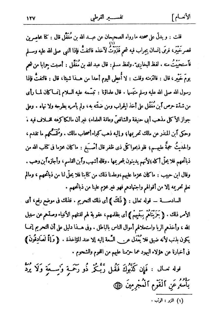 قُلْتُ: وَيَدُلُّ عَلَى صِحَّتِهِ مَا رَوَاهُ الصَّحِيحَانِ عَنْ عَبْدِ اللَّهِ بْنِ مُغَفَّلٍ قَالَ: كُنَّا مُحَاصِرِينَ قَصْرَ خَيْبَرَ، فَرَمَى إِنْسَانٌ بِجِرَابٍ فِيهِ شَحْمٌ فَنَزَوْتُ «١» لِآخُذَهُ فَالْتَفَتُّ فَإِذَا النَّبِيُّ صَلَّى اللَّهُ عَلَيْهِ وَسَلَّمَ فَاسْتَحْيَيْتُ مِنْهُ. لَفْظُ الْبُخَارِيِّ. وَلَفْظُ مُسْلِمٍ: قَالَ عَبْدُ اللَّهِ بْنُ مُغَفَّلٍ: أَصَبْتُ جِرَابًا مِنْ شَحْمٍ يَوْمَ خَيْبَرَ، قَالَ فَالْتَزَمْتُهُ وَقُلْتُ: لَا أُعْطِي الْيَوْمَ أَحَدًا مِنْ هَذَا شَيْئًا، قَالَ: فَالْتَفَتُّ فَإِذَا رَسُولُ اللَّهِ صَلَّى اللَّهُ عَلَيْهِ وَسَلَّمَ مُتَبَسِّمًا. قَالَ عُلَمَاؤُنَا: تَبَسُّمُهُ عَلَيْهِ السَّلَامُ إِنَّمَا كَانَ لِمَا رَأَى مِنْ شِدَّةِ حِرْصِ ابْنِ مُغَفَّلٍ عَلَى أَخْذِ الْجِرَابِ وَمِنْ ضِنَتِهِ بِهِ، وَلَمْ يَأْمُرْهُ بِطَرْحِهِ وَلَا نَهَاهُ. وَعَلَى جَوَازِ الْأَكْلِ مَذْهَبُ أَبِي حَنِيفَةَ وَالشَّافِعِيِّ وَعَامَّةِ الْعُلَمَاءِ، غَيْرَ أَنَّ مَالِكًا كَرِهَهُ لِلْخِلَافِ فِيهِ. وَحَكَى ابْنُ الْمُنْذِرِ عَنْ مَالِكٍ تَحْرِيمَهَا، وَإِلَيْهِ ذَهَبَ كُبَرَاءُ أَصْحَابِ مَالِكٍ. وَمُتَمَسَّكُهُمْ مَا تَقَدَّمَ، وَالْحَدِيثُ حُجَّةٌ عَلَيْهِمْ، فَلَوْ ذَبَحُوا كُلَّ ذِي ظُفُرٍ قَالَ أَصْبَغُ: مَا كَانَ مُحَرَّمًا فِي كِتَابِ اللَّهِ مِنْ ذَبَائِحِهِمْ فَلَا يَحِلُّ أَكْلُهُ، لِأَنَّهُمْ يَدِينُونَ بِتَحْرِيمِهَا. وَقَالَهُ أَشْهَبُ وَابْنُ الْقَاسِمِ، وَأَجَازَهُ ابْنُ وَهْبٍ. وَقَالَ ابْنُ حَبِيبٍ: مَا كَانَ مُحَرَّمًا عَلَيْهِمْ، وَعَلِمْنَا ذَلِكَ مِنْ كِتَابِنَا فَلَا يَحِلُّ لَنَا مِنْ ذَبَائِحِهِمْ، وَمَا لَمْ نَعْلَمْ تَحْرِيمَهُ إِلَّا مِنْ أَقْوَالِهِمْ وَاجْتِهَادِهِمْ فَهُوَ غَيْرُ مُحَرَّمٍ عَلَيْنَا مِنْ ذَبَائِحِهِمْ. السَّادِسَةُ- قَوْلُهُ تَعَالَى: (ذلِكَ) أَيْ ذَلِكَ التحريم. فذلك فِي مَوْضِعِ رَفْعٍ، أَيِ الْأَمْرُ ذَلِكَ. (جَزَيْناهُمْ بِبَغْيِهِمْ) أَيْ بِظُلْمِهِمْ، عُقُوبَةً لَهُمْ لِقَتْلِهِمُ الْأَنْبِيَاءَ وَصَدِّهِمْ عَنْ سَبِيلِ اللَّهِ، وَأَخْذِهِمُ الرِّبَا وَاسْتِحْلَالِهِمْ أَمْوَالَ النَّاسِ بِالْبَاطِلِ. وَفِي هَذَا دَلِيلٌ عَلَى أَنَّ التَّحْرِيمَ إِنَّمَا يَكُونُ بِذَنْبٍ، لِأَنَّهُ ضِيقٌ فَلَا يُعْدَلُ عَنِ السَّعَةِ إِلَيْهِ إِلَّا عِنْدَ الْمُؤَاخَذَةِ. (وَإِنَّا لَصادِقُونَ) فِي إِخْبَارِنَا عَنْ هَؤُلَاءِ الْيَهُودِ عَمَّا حَرَّمْنَا عَلَيْهِمْ مِنَ اللُّحُومِ وَالشُّحُومِ.