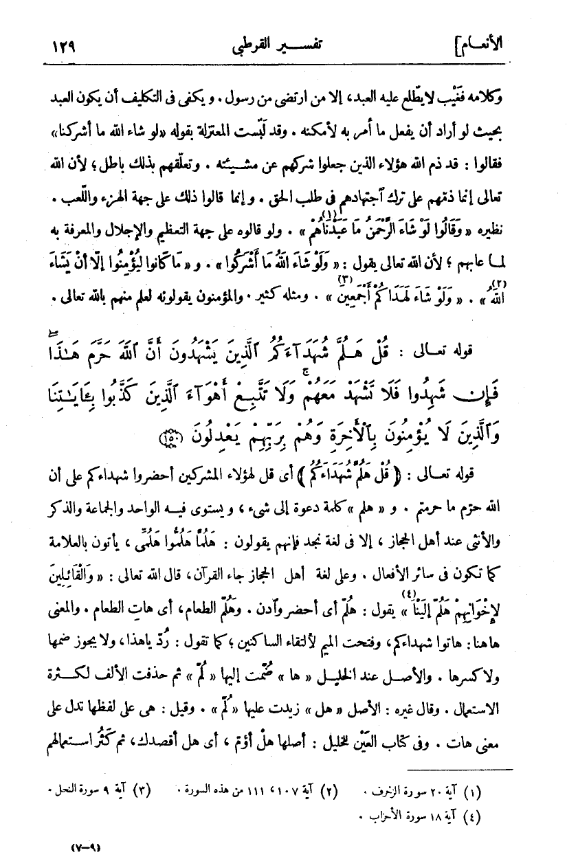 قَوْلُهُ تَعَالَى: (قُلْ هَلُمَّ شُهَداءَكُمُ) أَيْ قُلْ لِهَؤُلَاءِ الْمُشْرِكِينَ أَحْضِرُوا شُهَدَاءَكُمْ عَلَى أَنَّ اللَّهَ حَرَّمَ مَا حَرَّمْتُمْ. وَ" هَلُمَّ" كَلِمَةُ دَعْوَةٍ إِلَى شي، وَيَسْتَوِي فِيهِ الْوَاحِدُ وَالْجَمَاعَةُ وَالذَّكَرُ وَالْأُنْثَى عِنْدَ أَهْلِ الْحِجَازِ، إِلَّا فِي لُغَةِ نَجْدٍ فَإِنَّهُمْ يَقُولُونَ: هَلُمَّا هَلُمُّوا هَلُمِّي، يَأْتُونَ بِالْعَلَامَةِ كَمَا تَكُونُ فِي سَائِرِ الْأَفْعَالِ. وَعَلَى لُغَةِ (أَهْلِ»